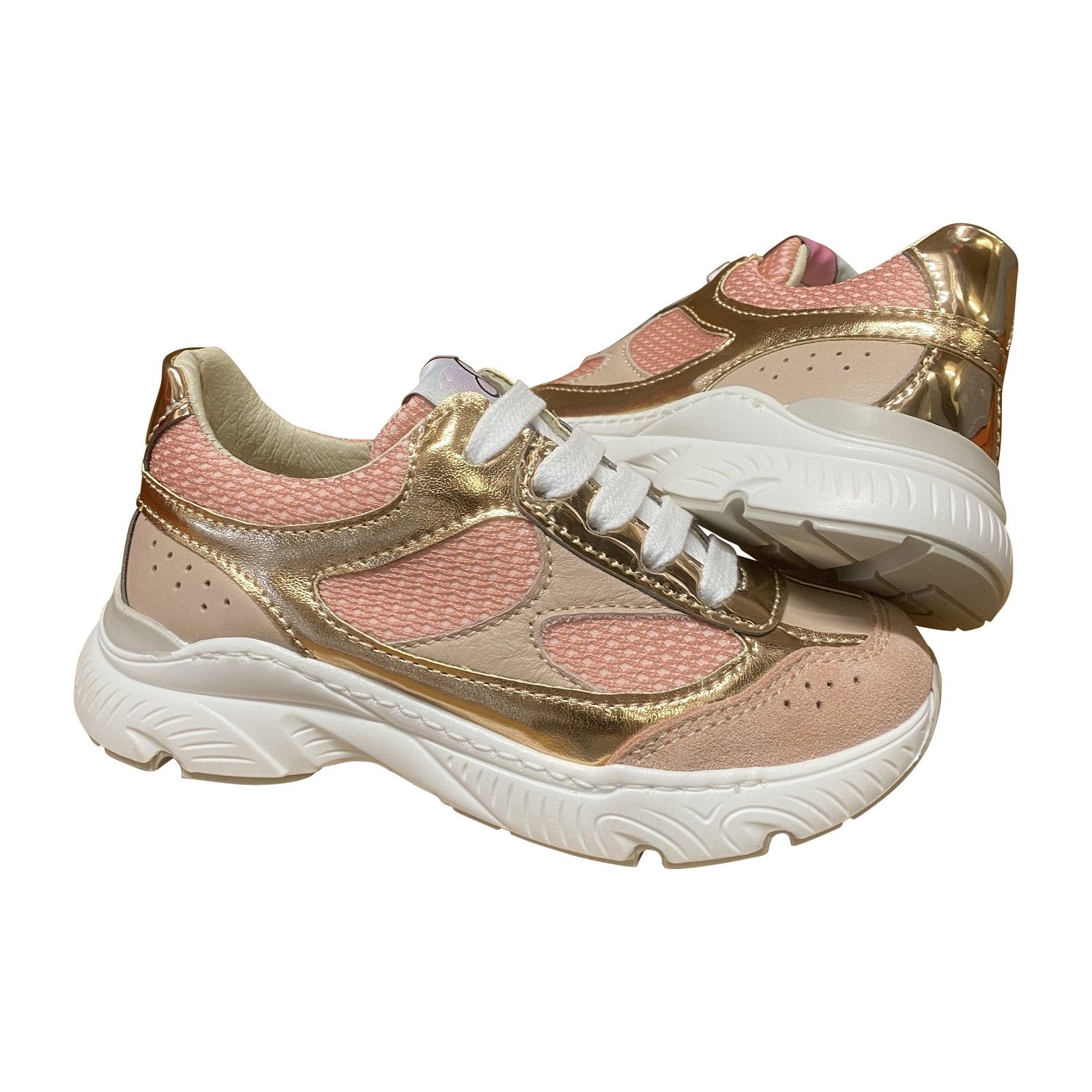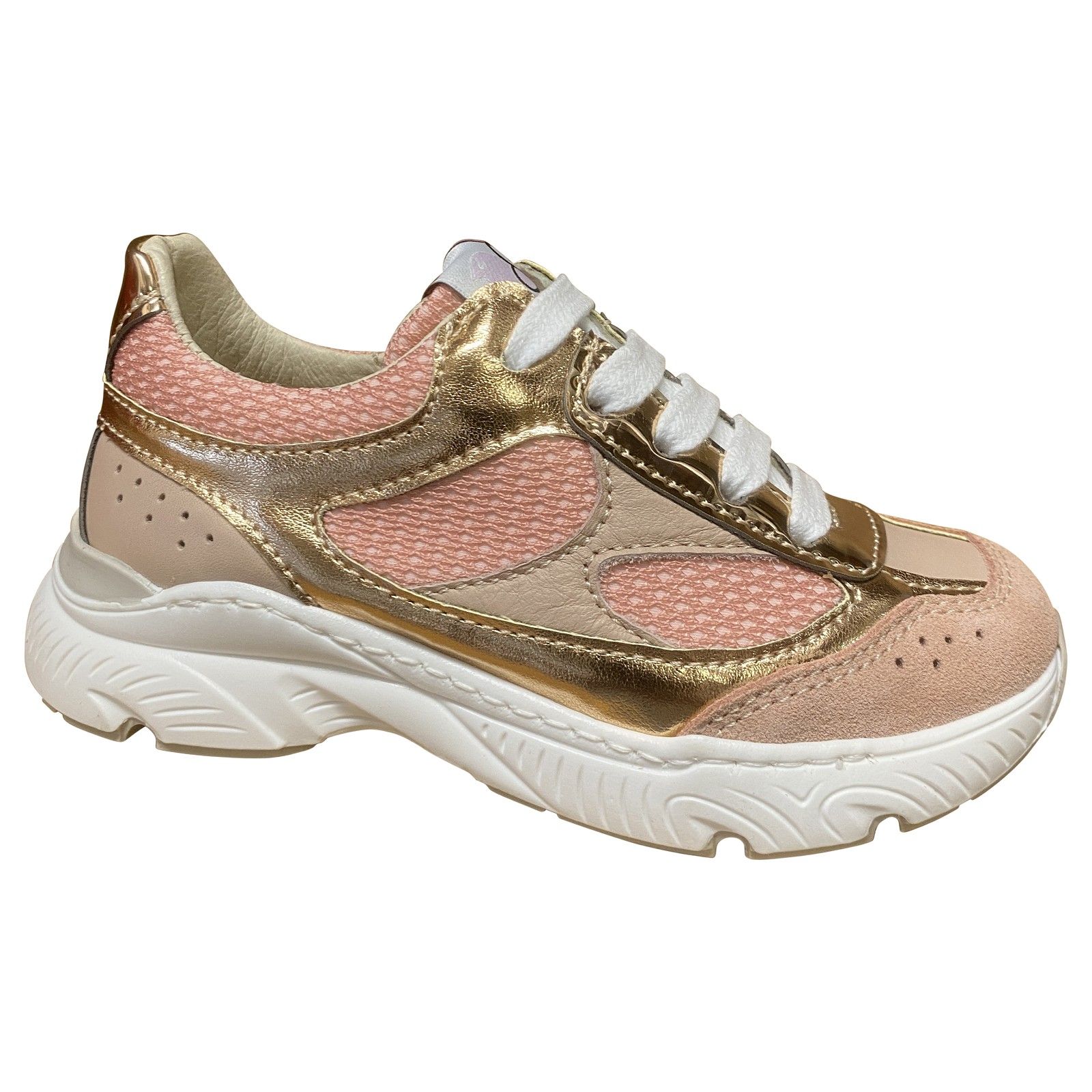 Sportieve meisjes runner in zalmkleur, gecombineerd met nude en platina biesjes voor een trendy uitstraling. De lichte, flexibele zool zorgt voor extra comfort en goede ondersteuning bij actief gebruik. Ideaal als dagelijkse sneaker, maar ook perfect te combineren met een meer geklede outfit.
