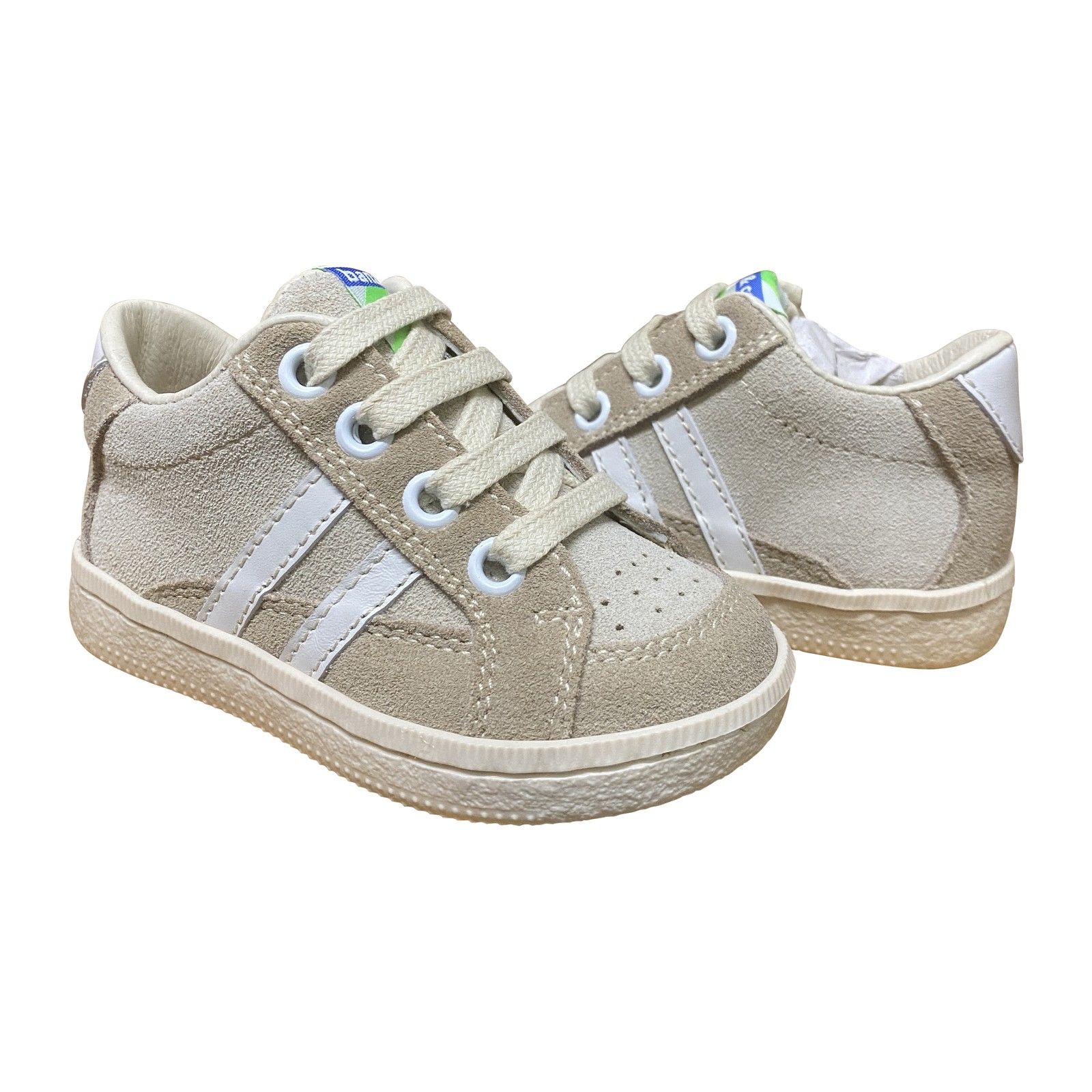 Sportieve jongens eerste stapper van Bana&Co in zachte beige kleuren.