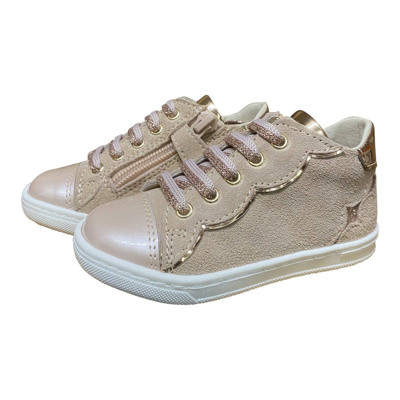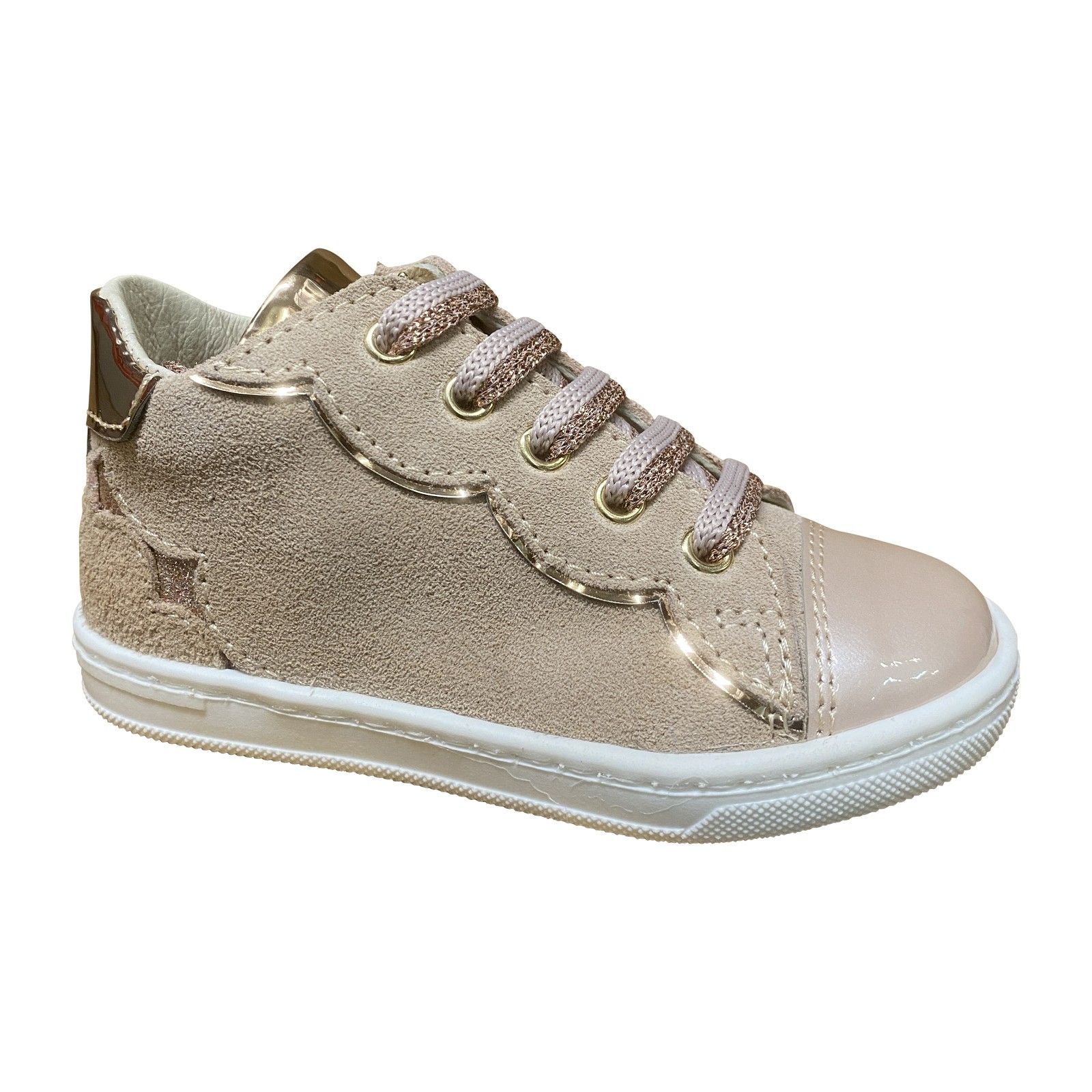 Stijlvolle eerste stapper in zachte nude tint met lak topje.
