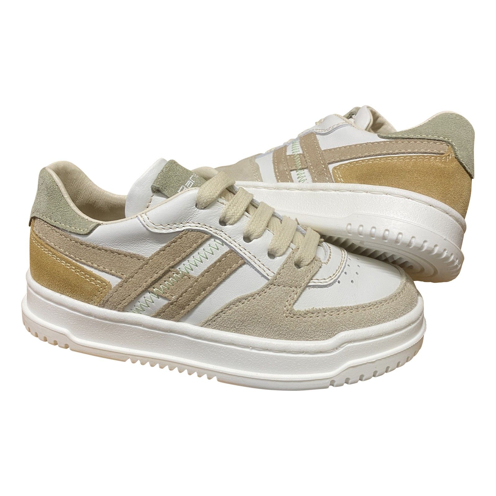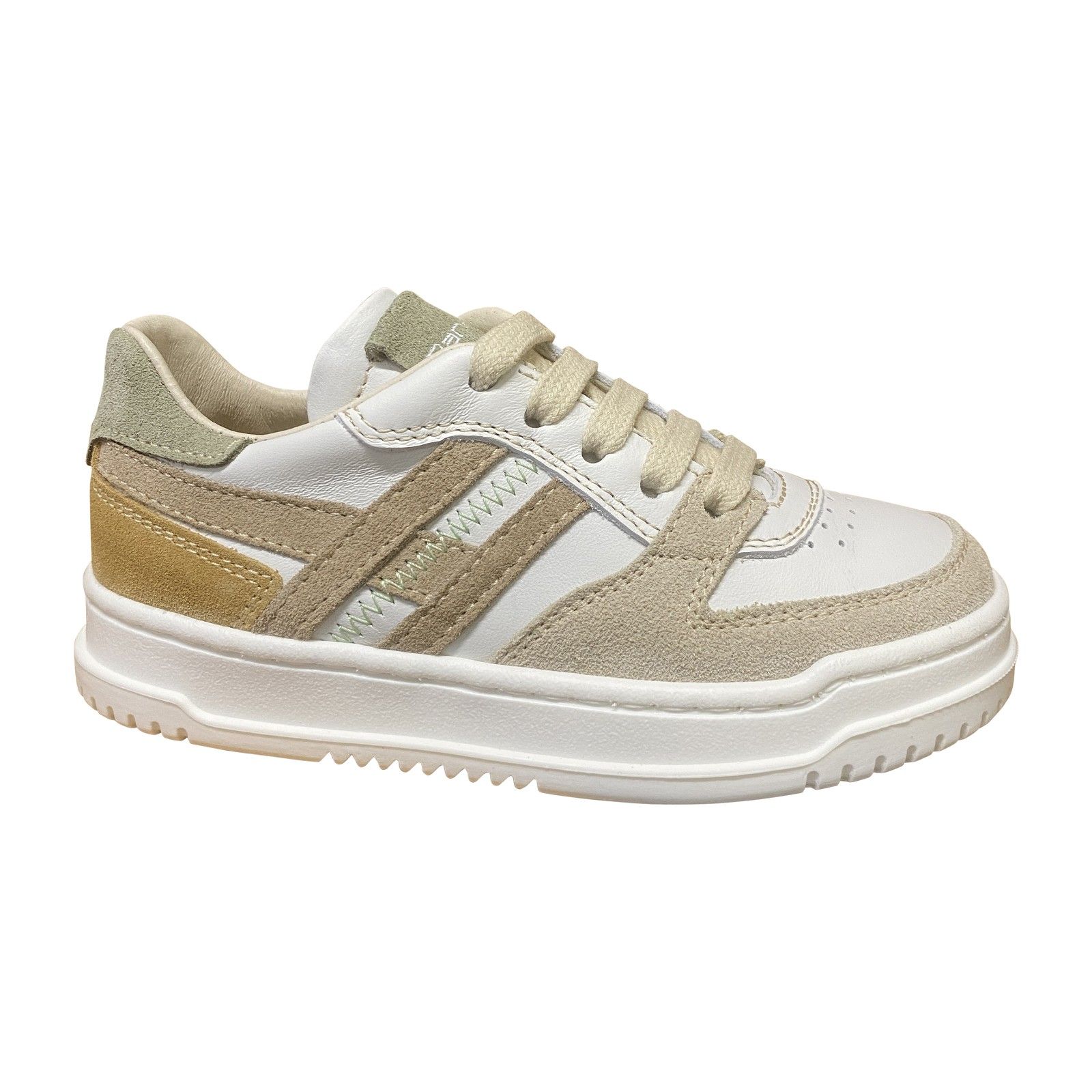 Lage jongenssneaker in off white met zachte beige accenten.