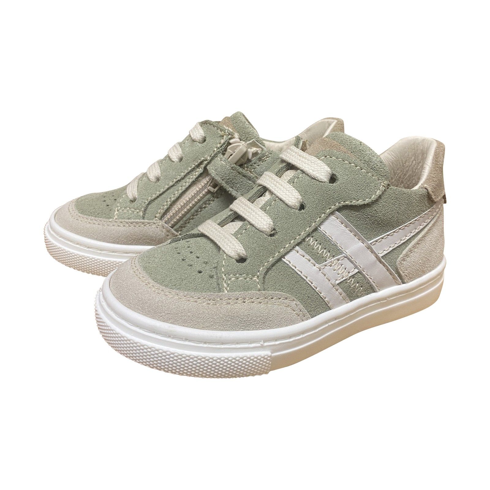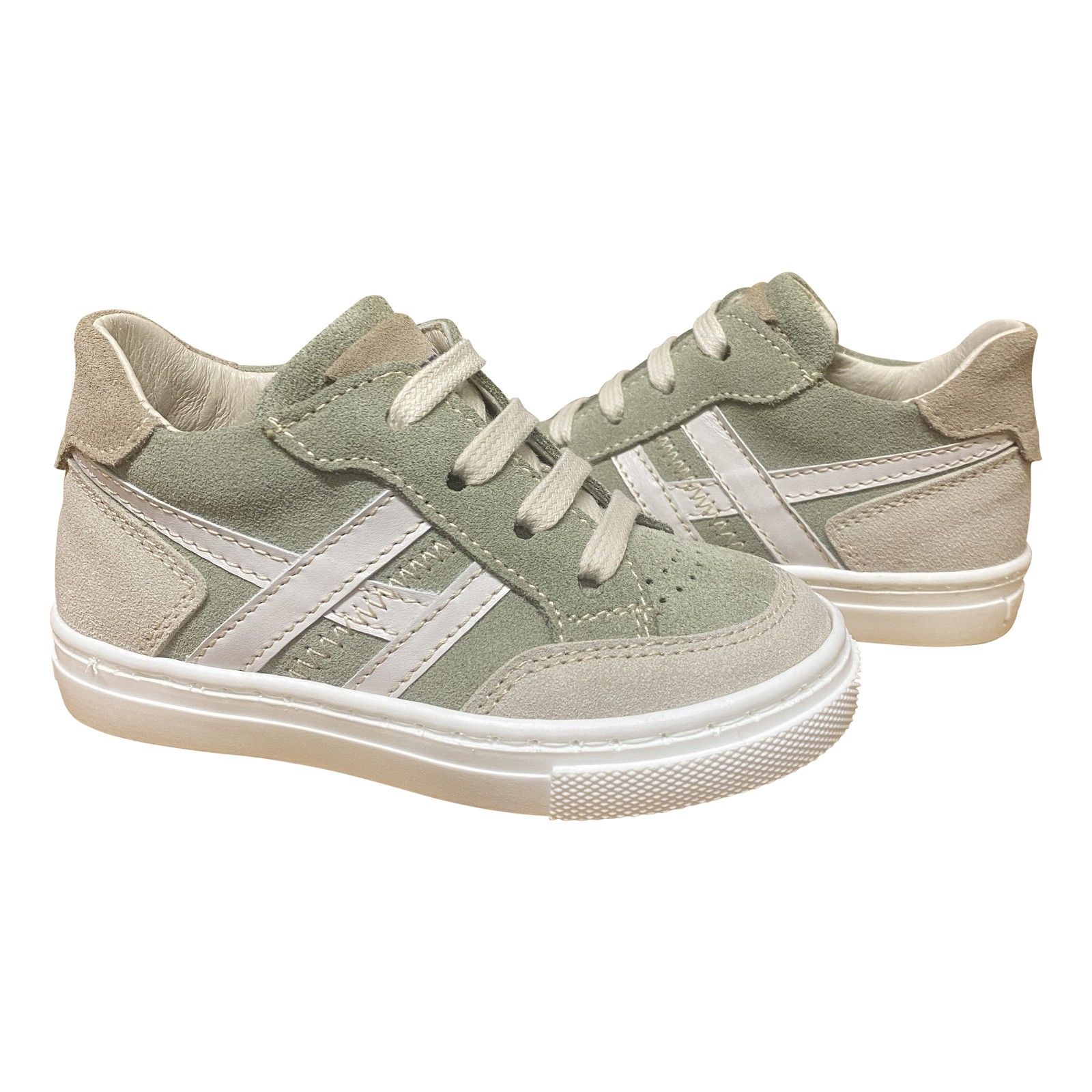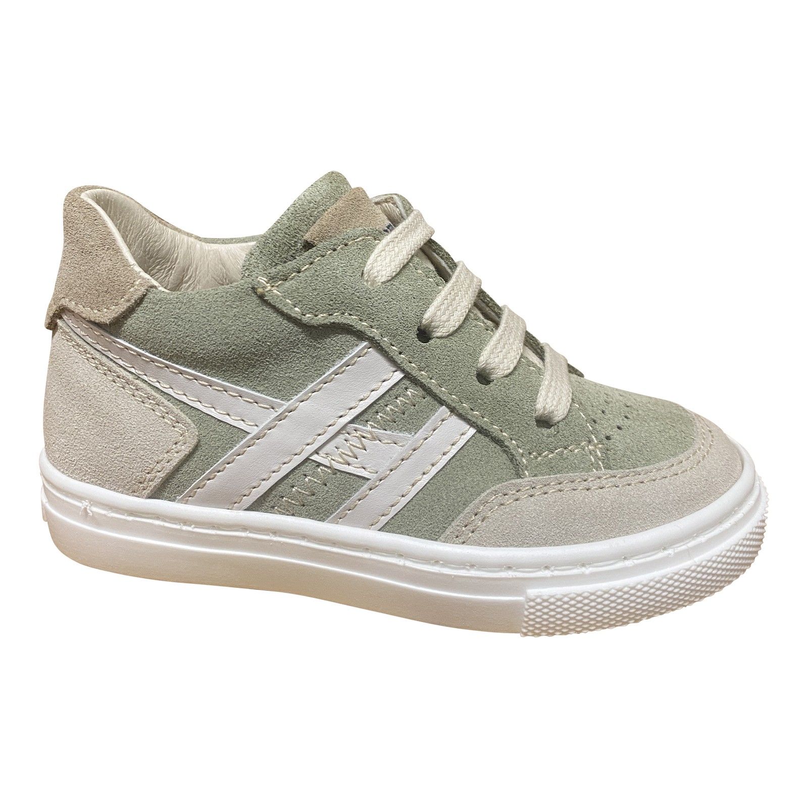 Sportieve eerste stapper in kaki tint met taupe en beige accenten aan de zijkant.