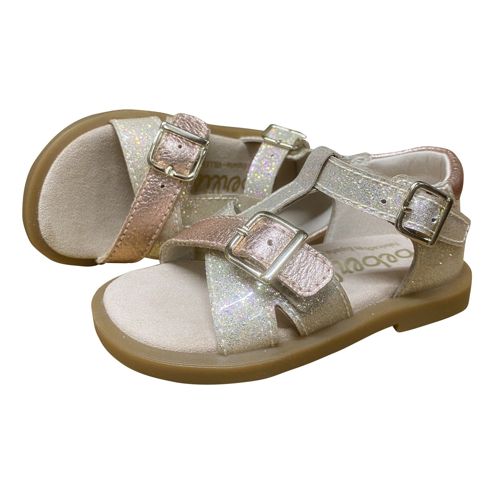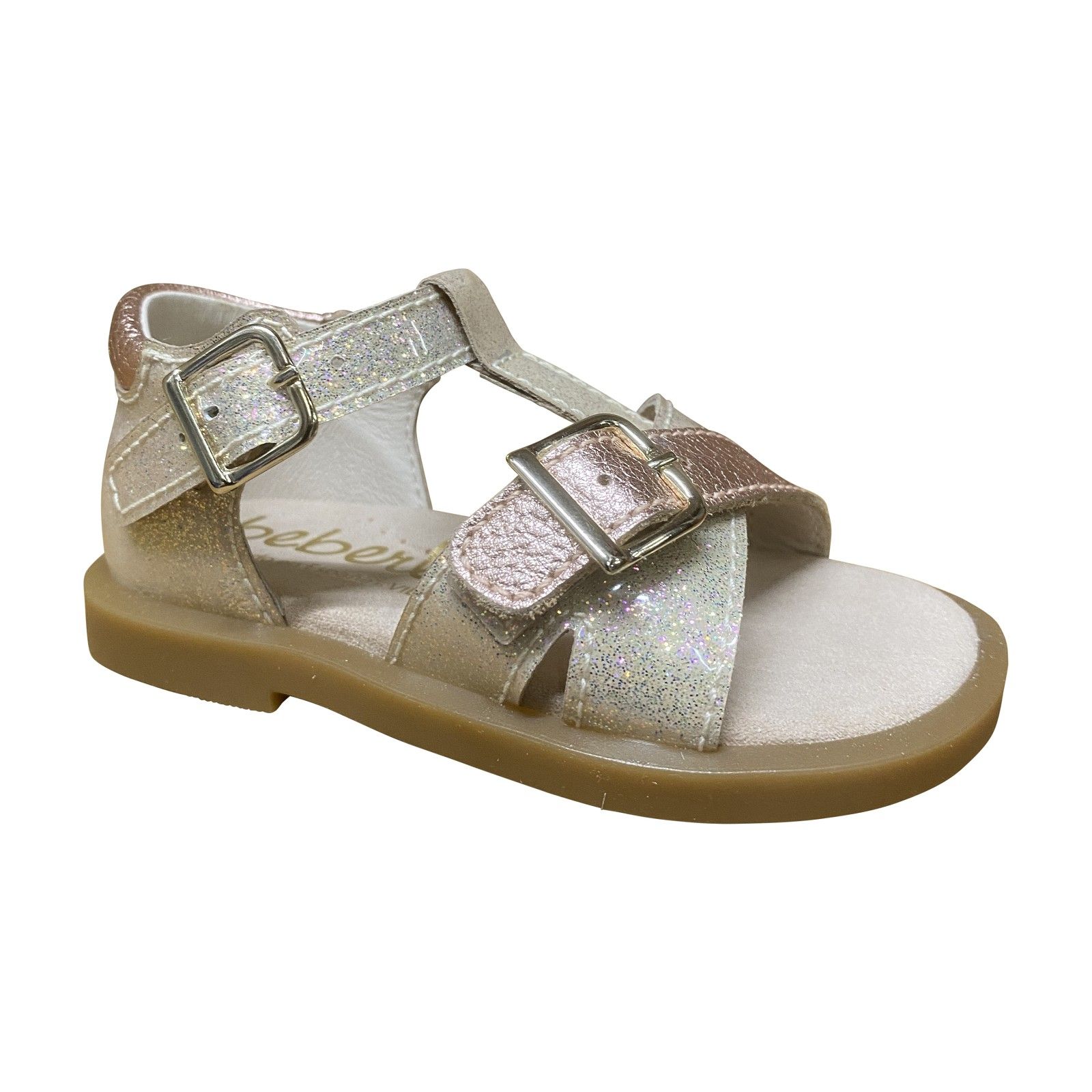 Deze Beberlis sandaal met dichte hiel biedt extra steun en is ideaal voor smalle voetjes. Het T-band model met verstelbare sluiting op de wreef zorgt voor een goede pasvorm en stabiliteit. Het glittermateriaal in platina met nude accenten geeft de sandaal een elegante uitstraling. Gemaakt van zachte materialen en voorzien van een flexibele zool voor fijn draagcomfort.