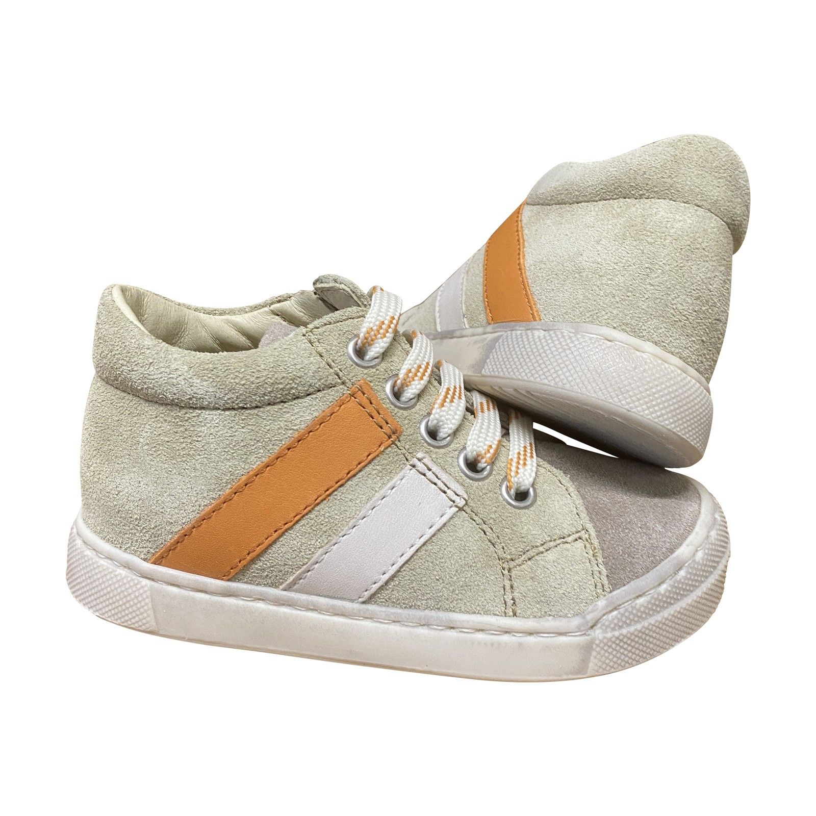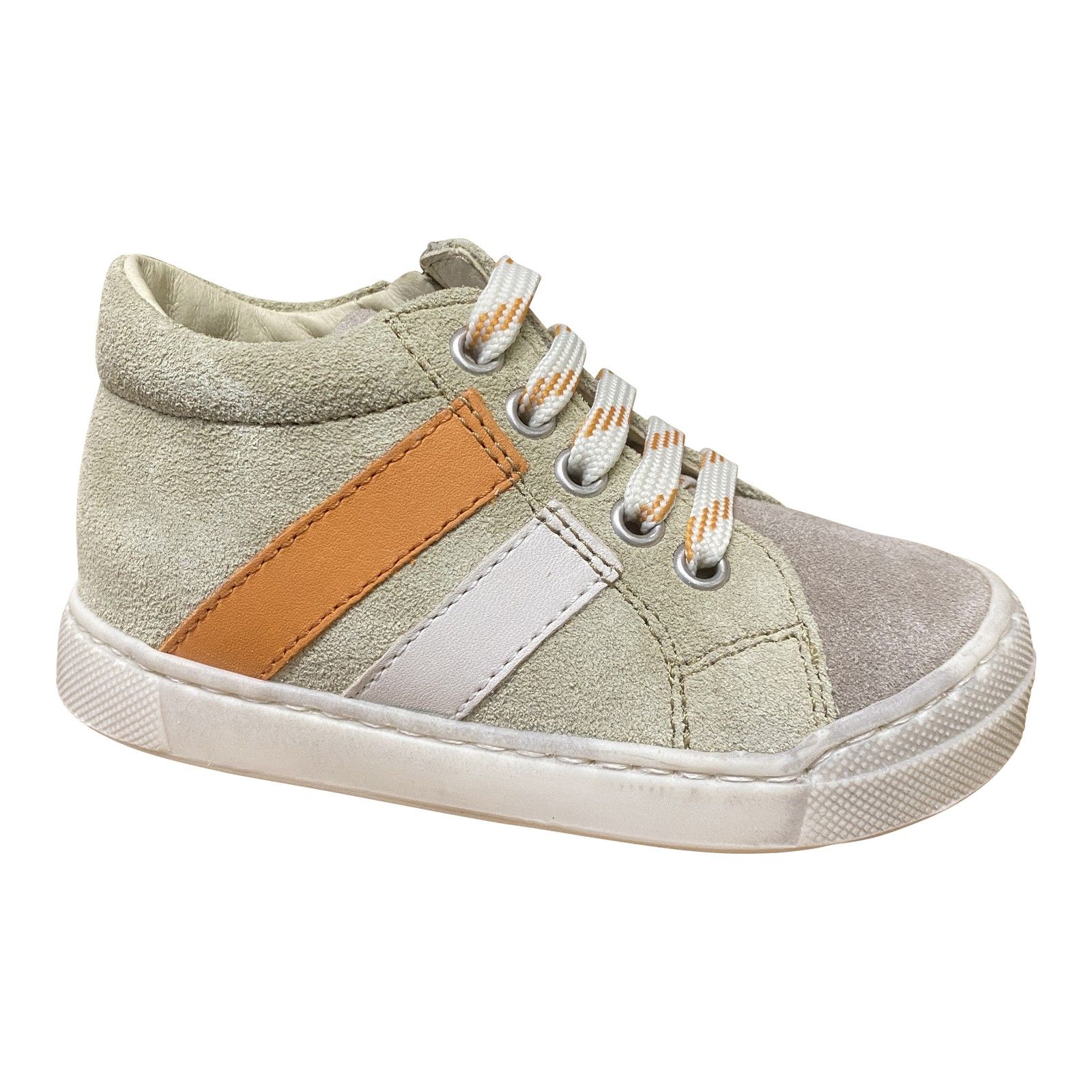 Deze stoere basket voor jongens is uitgevoerd in taupe nubuck en afgewerkt met contrasterende zij-accenten in twee kleuren voor een sportieve look.