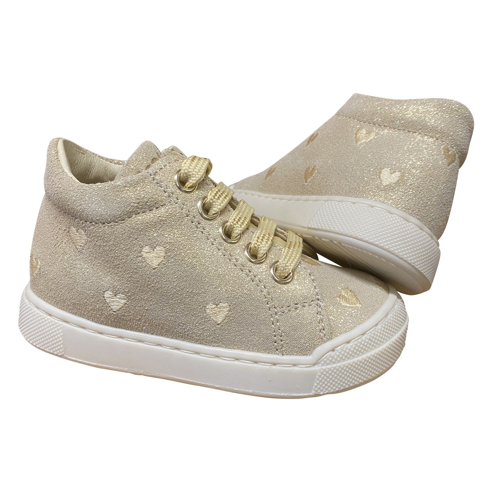 Deze meisjes basket is uitgevoerd in beige nubuck en afgewerkt met geborduurde hartjes in zachte pastel tinten, wat zorgt voor een lieve en speelse uitstraling.