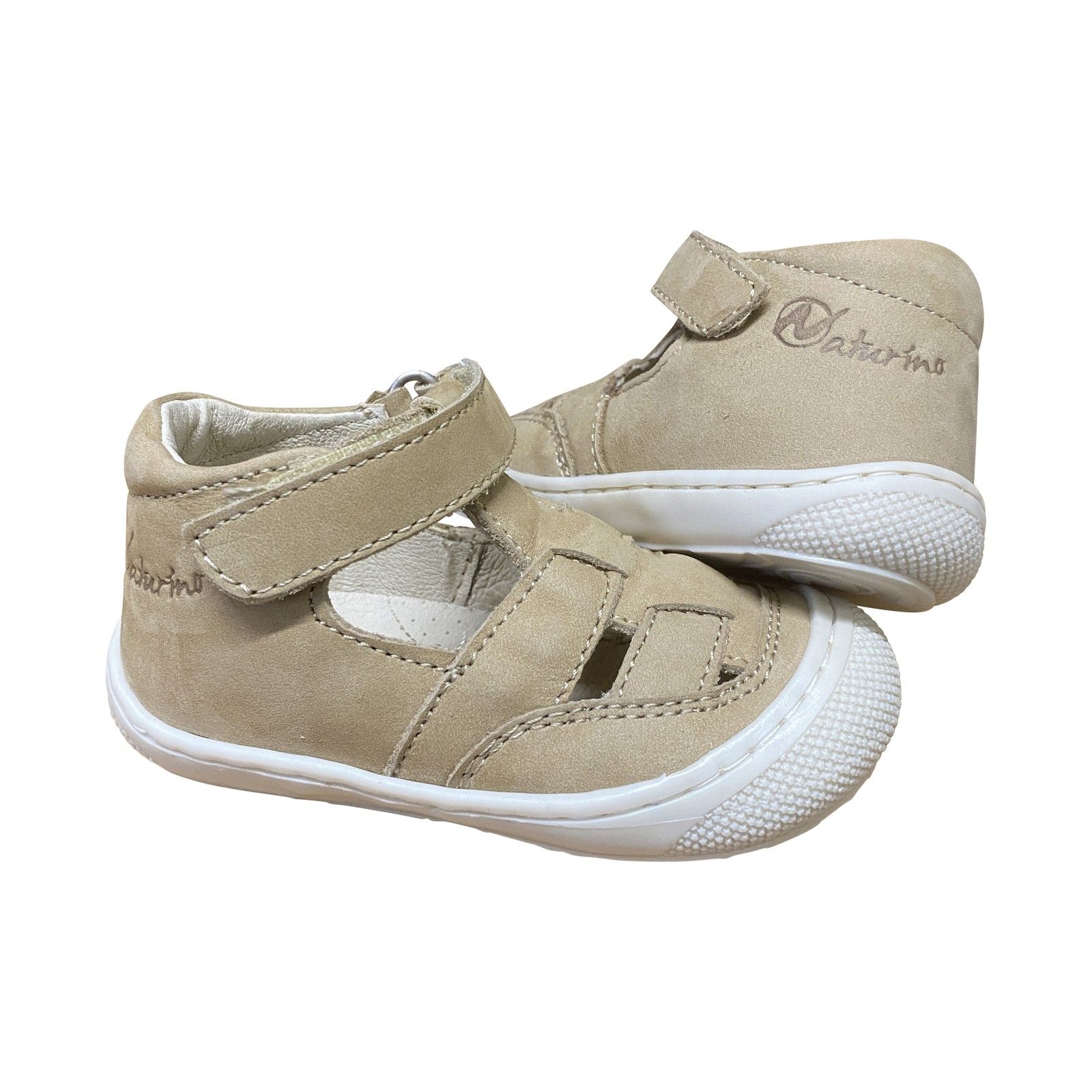 Eerste baby sandaal met T-bandje en velcro sluiting, uitgevoerd in taupe nubuck. Dit soepele model sluit mooi aan rond de voet en biedt voldoende bewegingsvrijheid bij kruipen en de eerste stapjes.