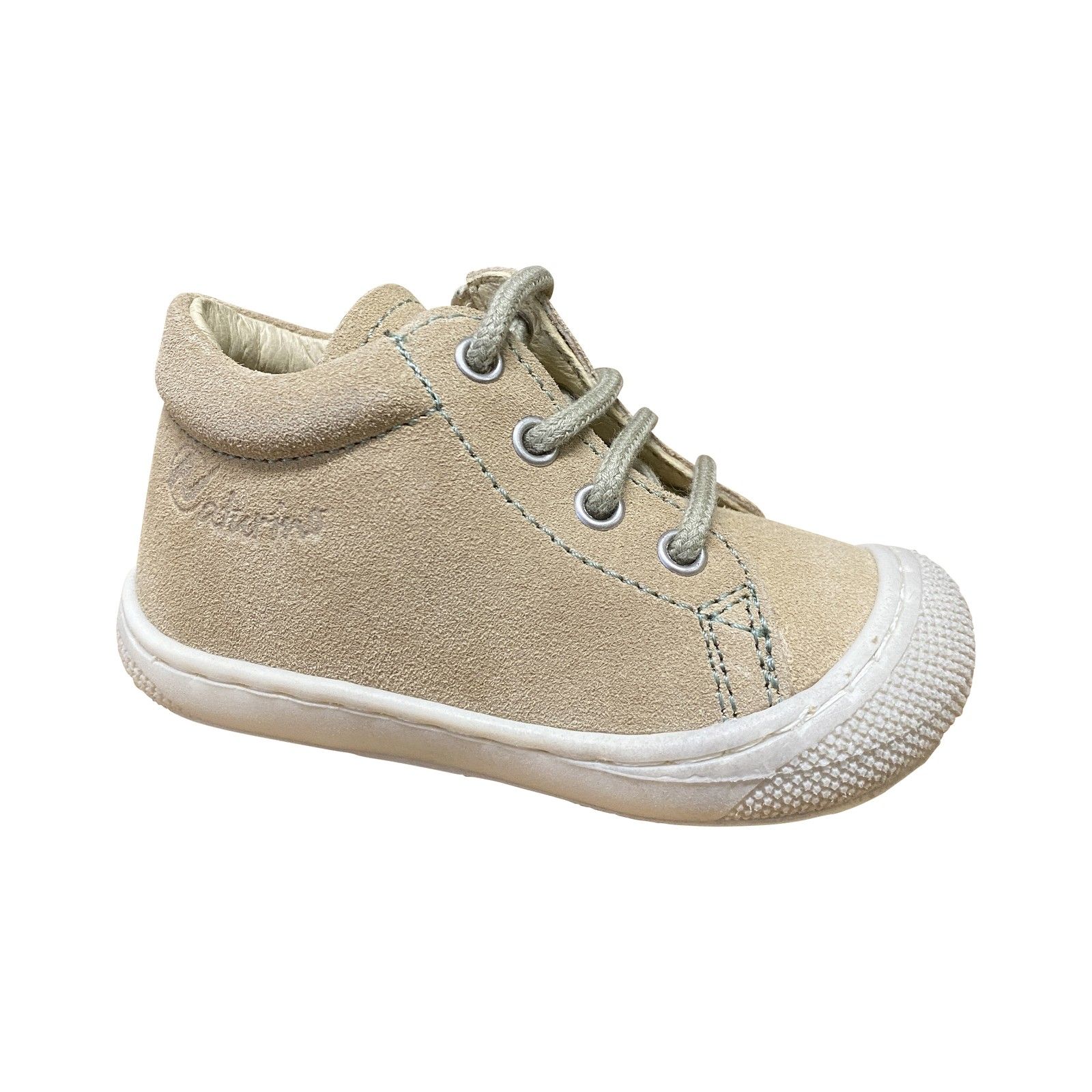 Eerste baby veterschoentje in taupe nubuck. Dit model is soepel en licht, ideaal voor kruipen en de eerste stapjes.