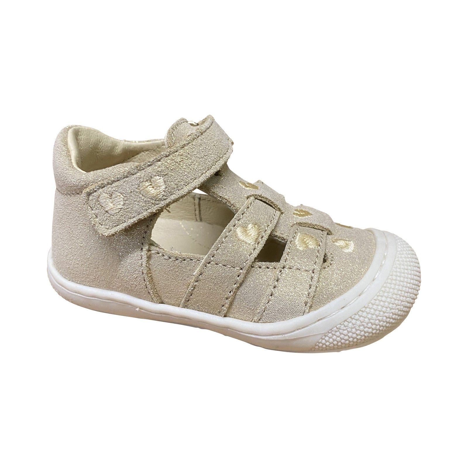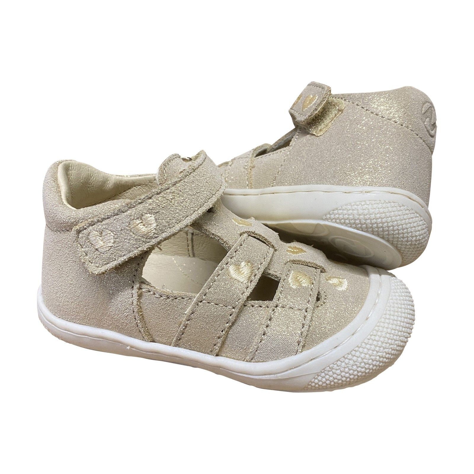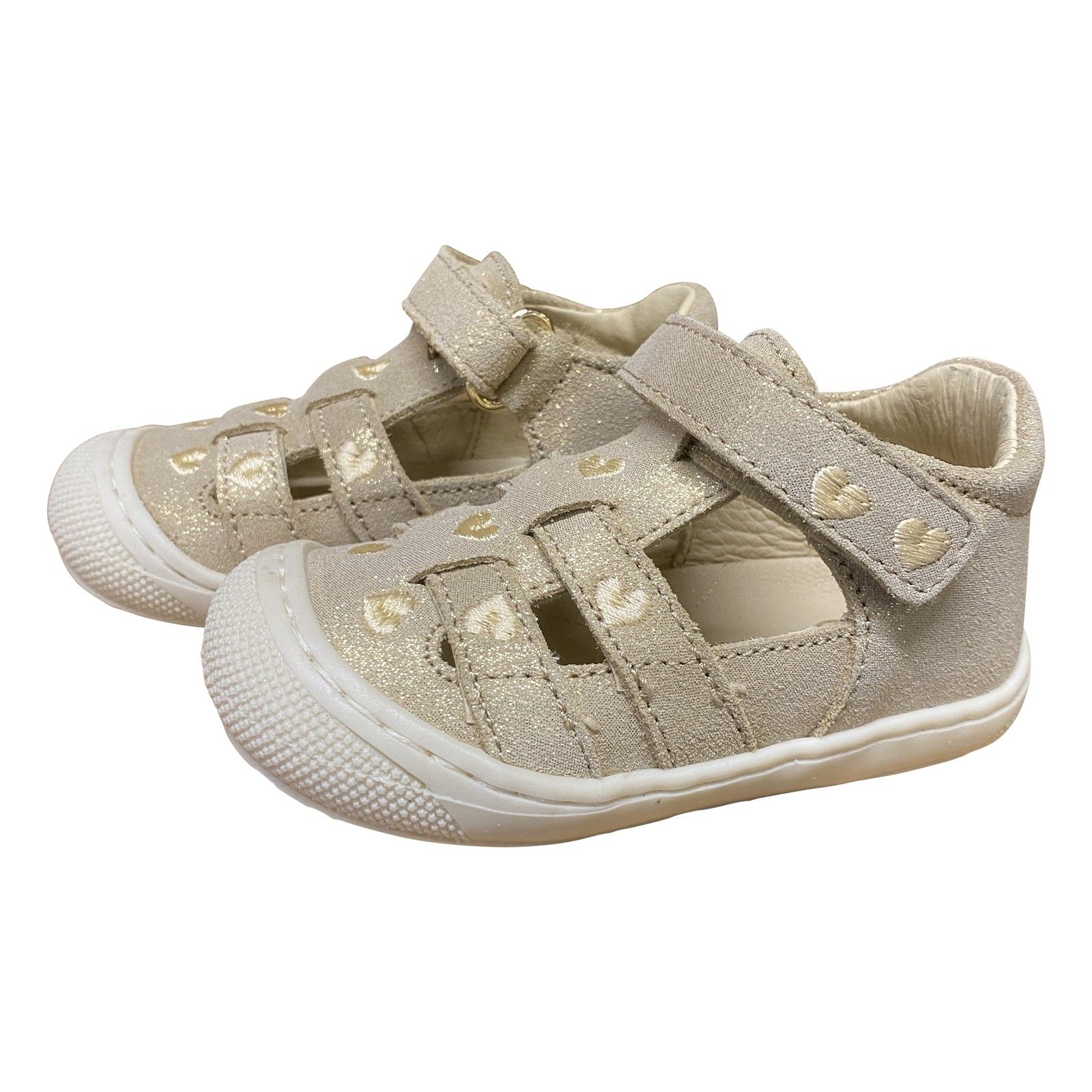 Dit Cocoon sandaaltje voor meisjes is uitgevoerd in taupe nubuck en afgewerkt met fijn geborduurde hartjes voor een speelse, zachte uitstraling.