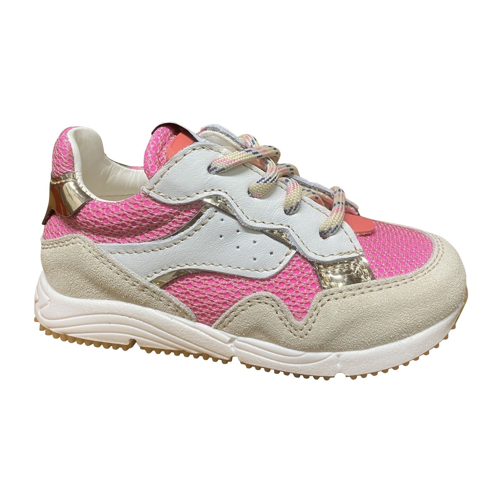 Sportieve meisjesrunner met koraalkleurige mesh, gecombineerd met beige suède en wit leer. Het speelse kleurenspel geeft deze sneaker een frisse uitstraling. De zachte materialen zorgen voor draagcomfort, terwijl de stevige zool voldoende ondersteuning biedt bij actief bewegen. Dankzij de veter- en ritssluiting is het model makkelijk aan en uit te trekken en goed aanpasbaar aan de voet.