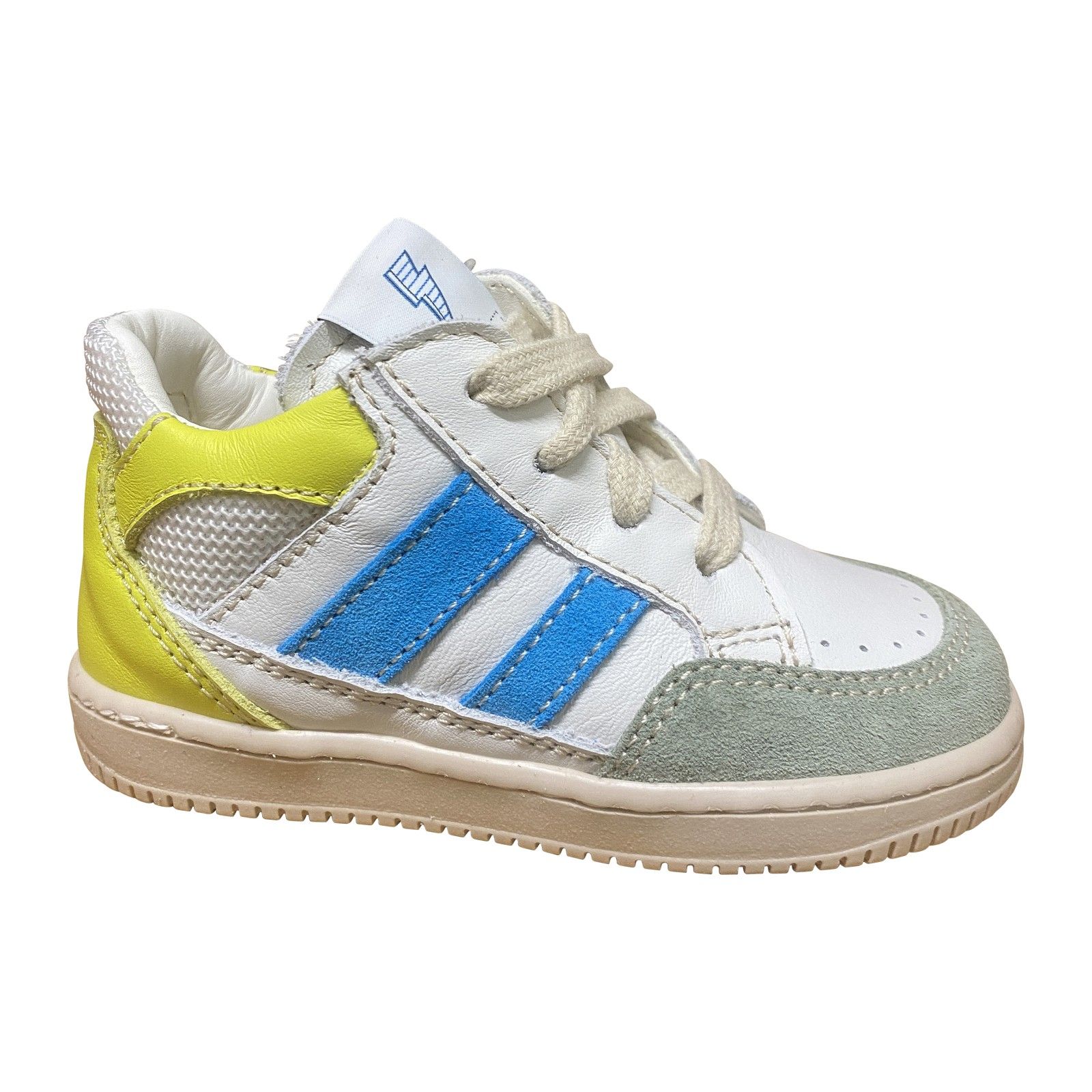 Sportieve basketter in off-white tinten met een speels kleurenpalet. De combinatie van soepel leer en suede zorgt voor een stevige en aangename pasvorm. Dit model biedt goede ondersteuning en stabiliteit, ideaal voor stoere jongens die hun eerste stapjes zetten. Geschikt voor dagelijks gebruik.