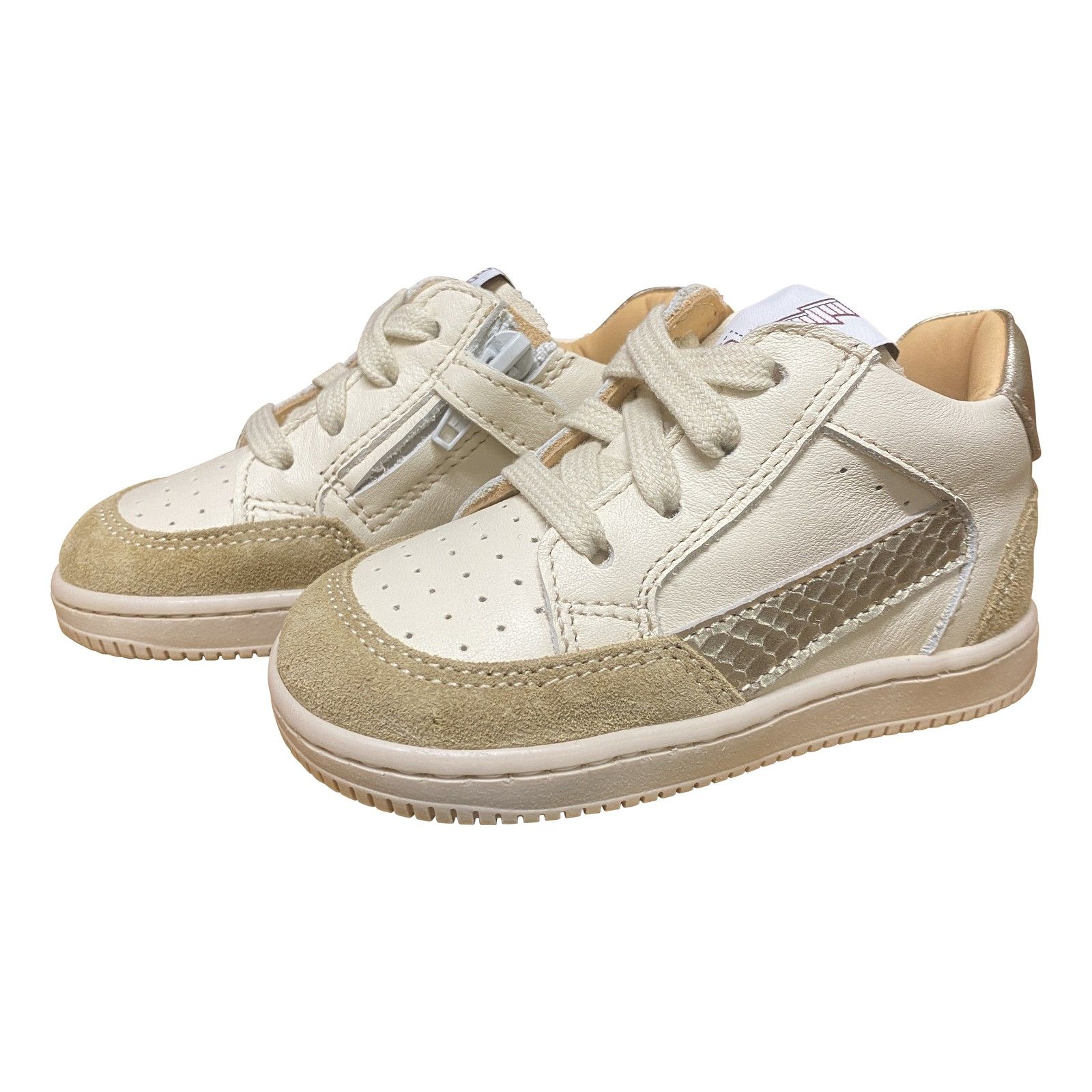 Stoere lage basketter in zachte beige tinten, ideaal als eerste stapper. Het suède en gladde leer zorgen voor een comfortabele en stevige pasvorm. Het platina streepje aan de zijkant geeft de sneaker een extra stoere, sportieve look. Dankzij de combinatie van veter en ritssluiting is de schoen makkelijk aan en uit te trekken, perfect voor kleine ontdekkers.