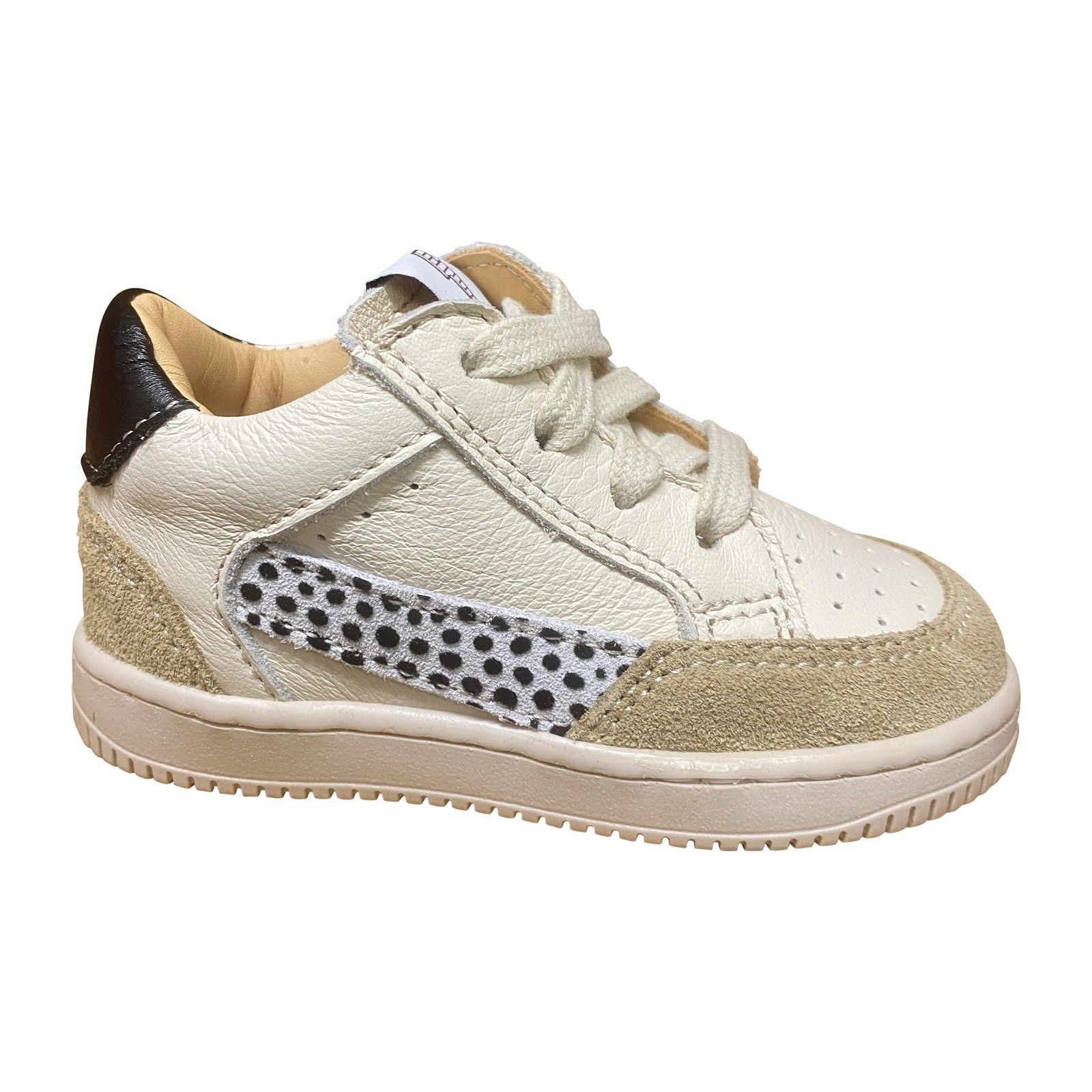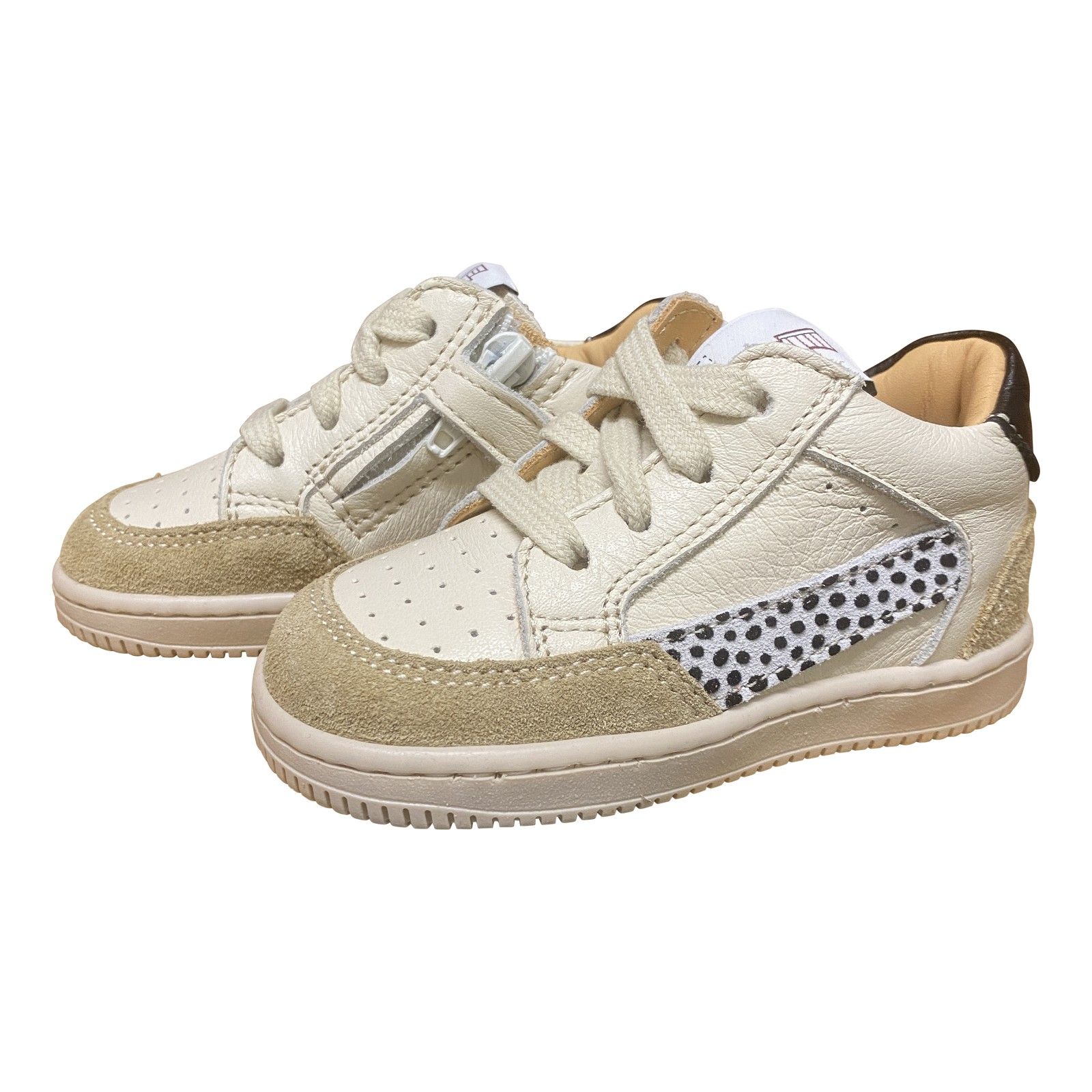Stoere lage basketter in zachte beige tinten, ideaal als eerste stapper. Het suède en gladde leer zorgen voor een comfortabele en stevige pasvorm. Het speelse accent aan de zijkant geeft de sneaker een sportieve look. De combinatie van veter en ritssluiting maakt aan- en uittrekken eenvoudig en praktisch voor kleine voetjes.