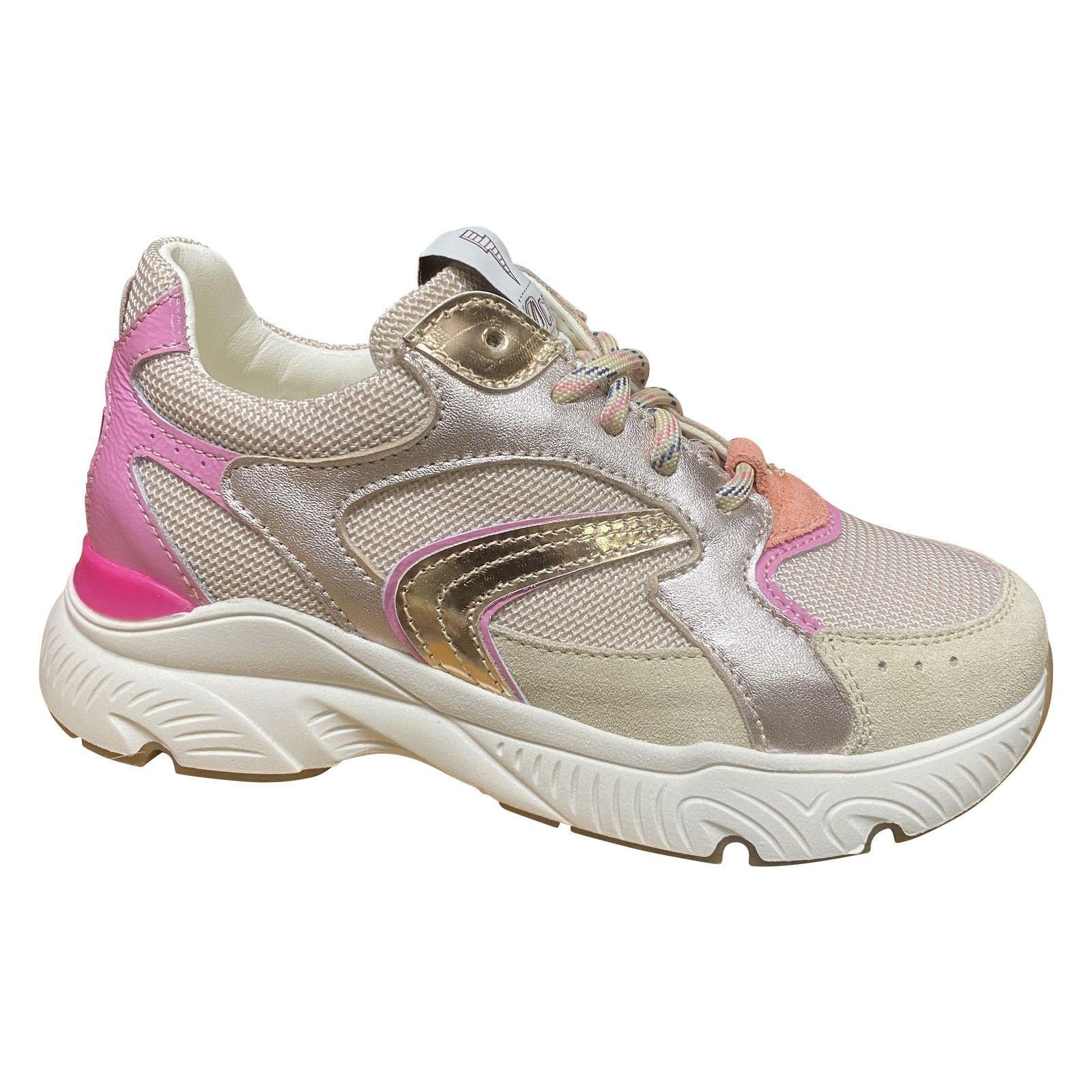 Sportieve runner voor meisjes met veter- en ritssluiting voor een vlotte instap. Dit model valt op door het speelse kleurenpalet met metallic accenten in goud en roze, gecombineerd met mesh en suede details. De sportieve zool zorgt voor stabiliteit en maakt deze runner ideaal voor actieve dagen. Stoer, opvallend en comfortabel.