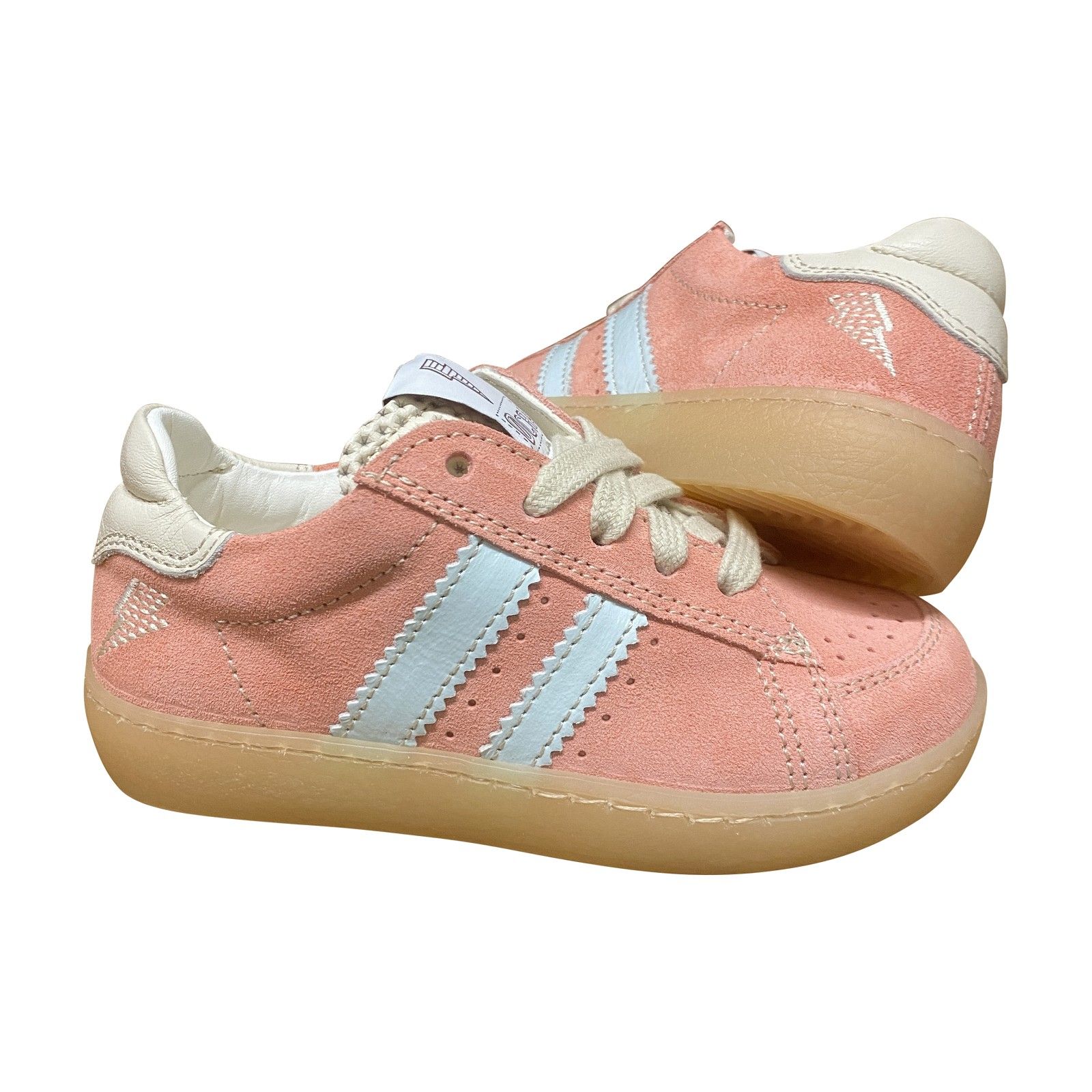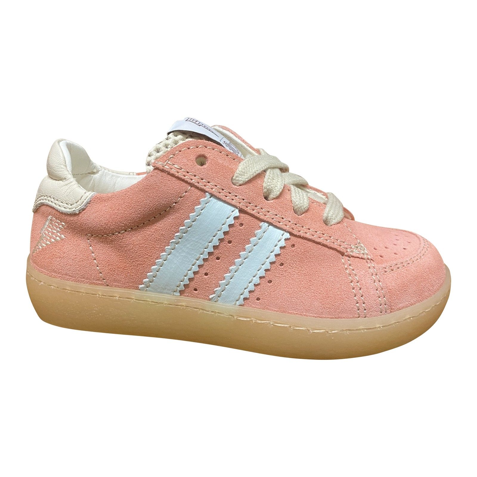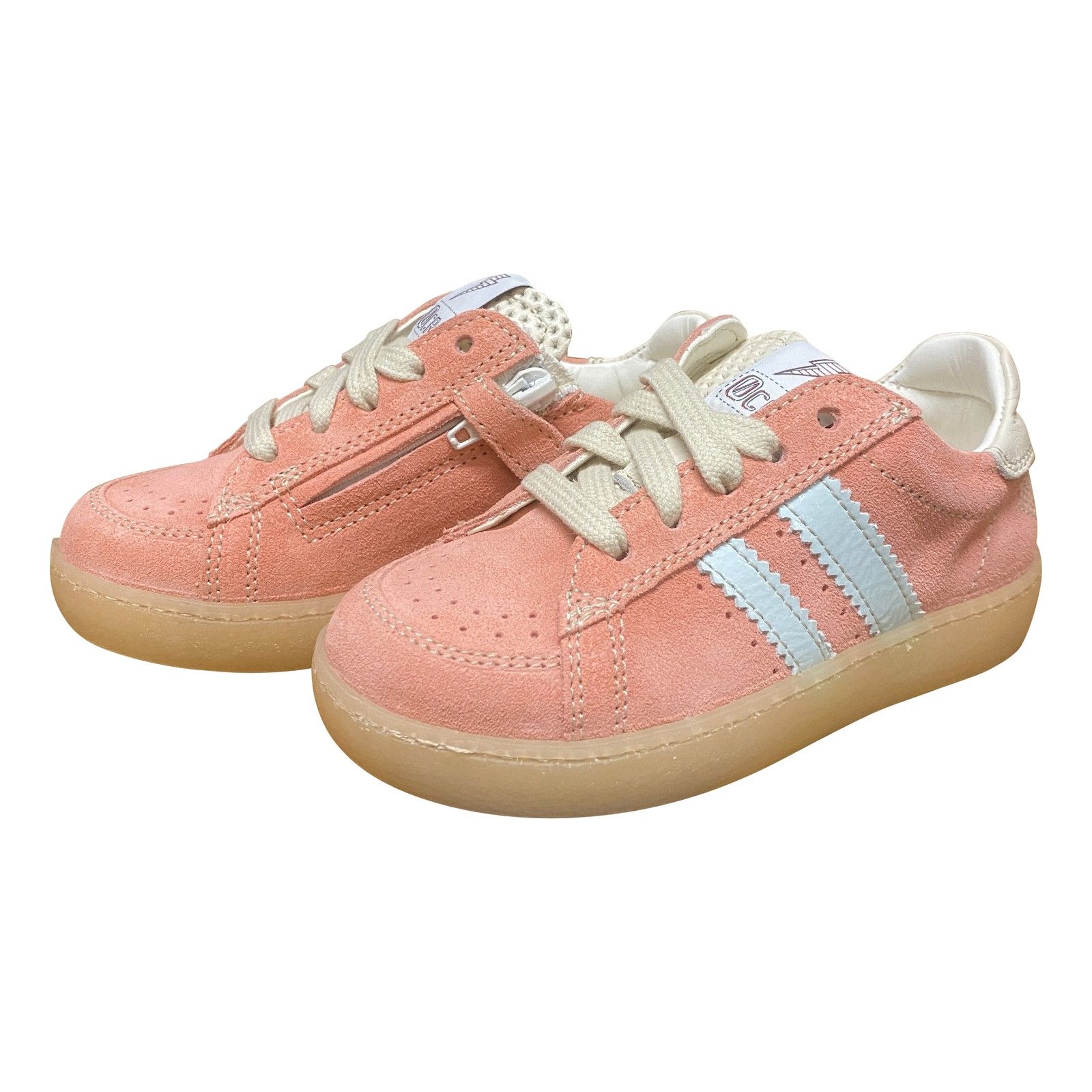 Sportieve lage sneaker in een frisse koraalkleur met twee witte strepen aan de zijkant. Het zachte suède geeft de schoen een comfortabele feel en een eigentijdse uitstraling. De combinatie van veter en ritssluiting zorgt voor een makkelijke instap en een goede pasvorm. Ideaal voor een sportieve look, elke dag opnieuw.