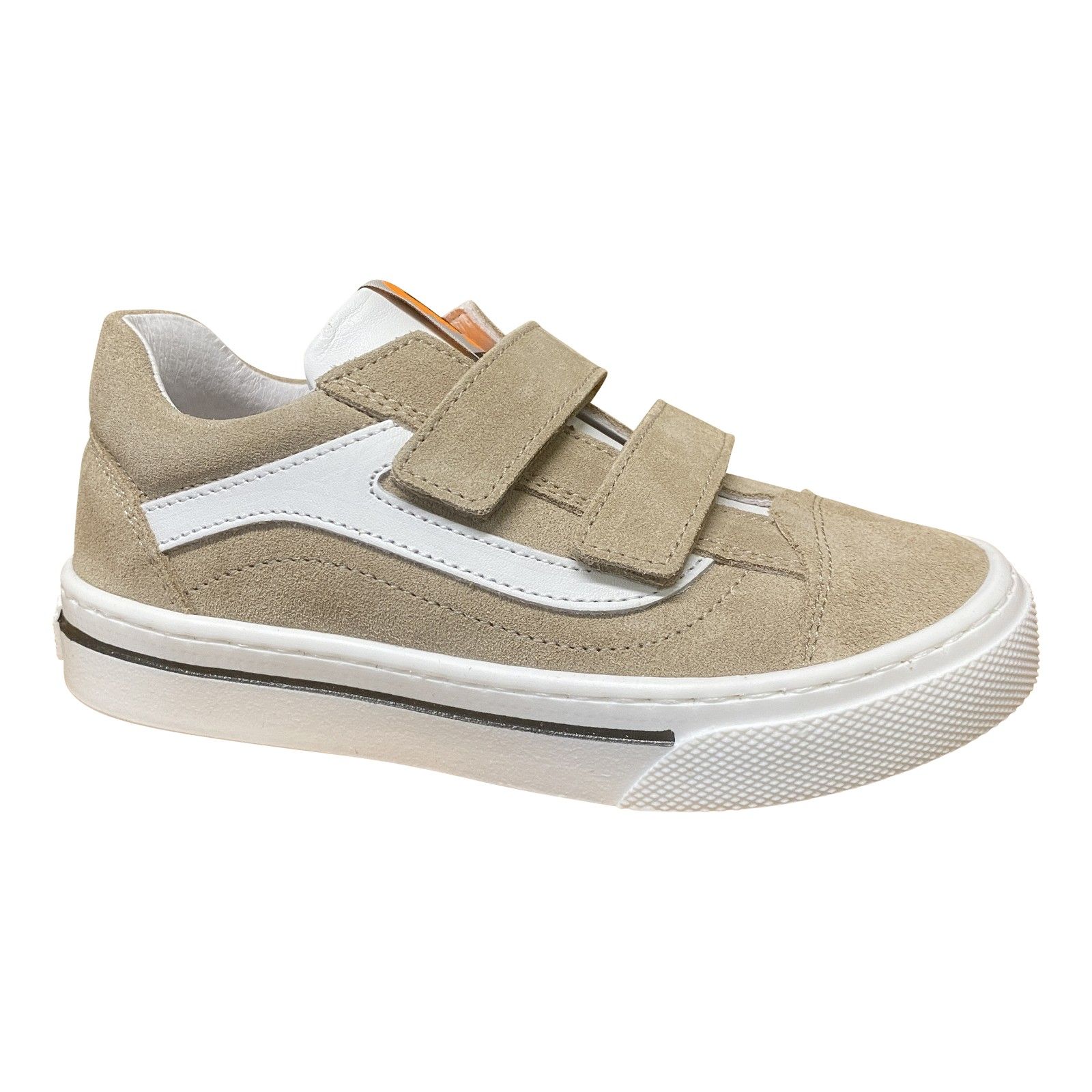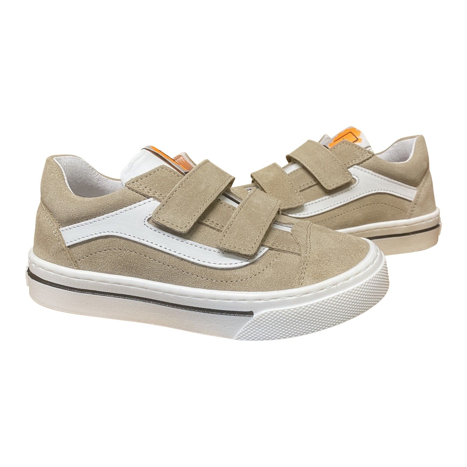 Deze sportieve jongenssneaker van Poldino is uitgevoerd in zandkleur beige/taupe fijne crosta leder en afgewerkt met een witte sportieve streep voor een frisse look. De dubbele velcro sluiting zorgt voor een makkelijke instap en een goede pasvorm. Comfortabel, licht en ideaal voor dagelijks gebruik, school en spelen.