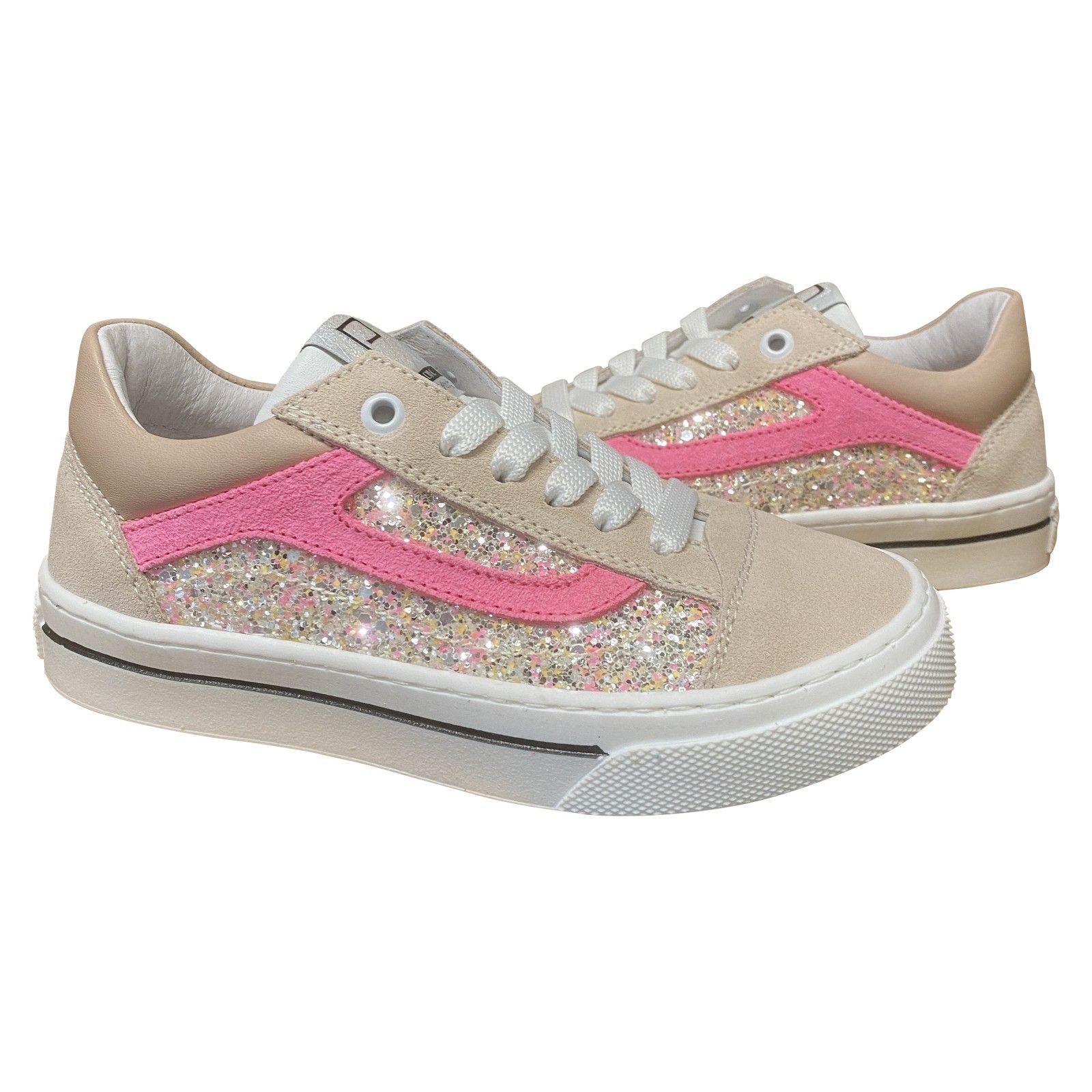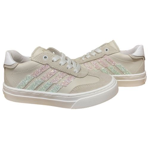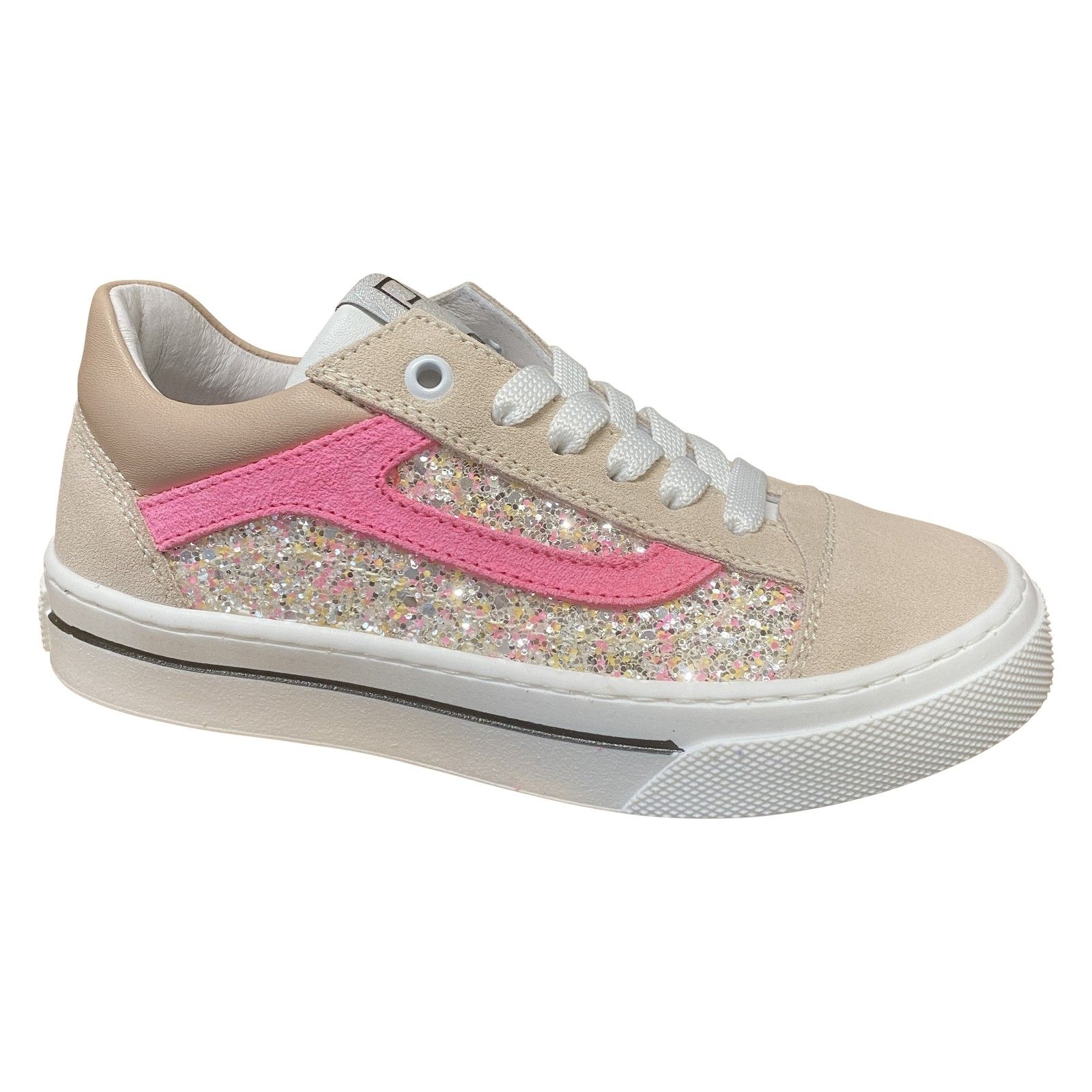 Deze stoere meisjessneaker van Poldino is uitgevoerd in zandkleur fijne crosta leder en afgewerkt met subtiele glitter aan de zijkant en een roze sportieve streep. De combinatie van veters en een handige rits zorgt voor een perfecte pasvorm en makkelijke instap. Dankzij de comfortabele zool en zachte materialen is deze sneaker ideaal voor dagelijks gebruik en actieve dagen.