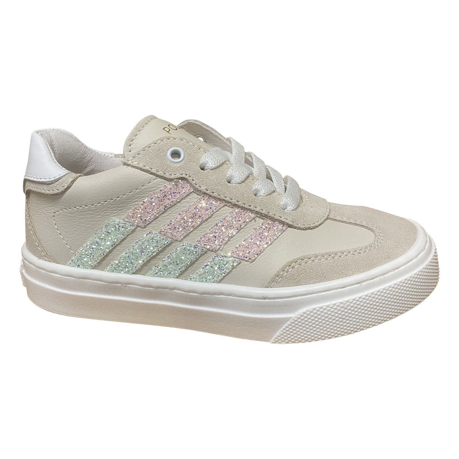 Deze stoere meisjessneaker van Poldino is uitgevoerd in beige fijne crosta leder en afgewerkt met subtiele pastelgekleurde glitterstrepen voor een speelse, elegante touch. De combinatie van veters en rits zorgt voor een goede pasvorm en een makkelijke instap. De comfortabele zool en zachte materialen maken deze sneaker ideaal voor dagelijks gebruik en actieve momenten.