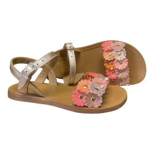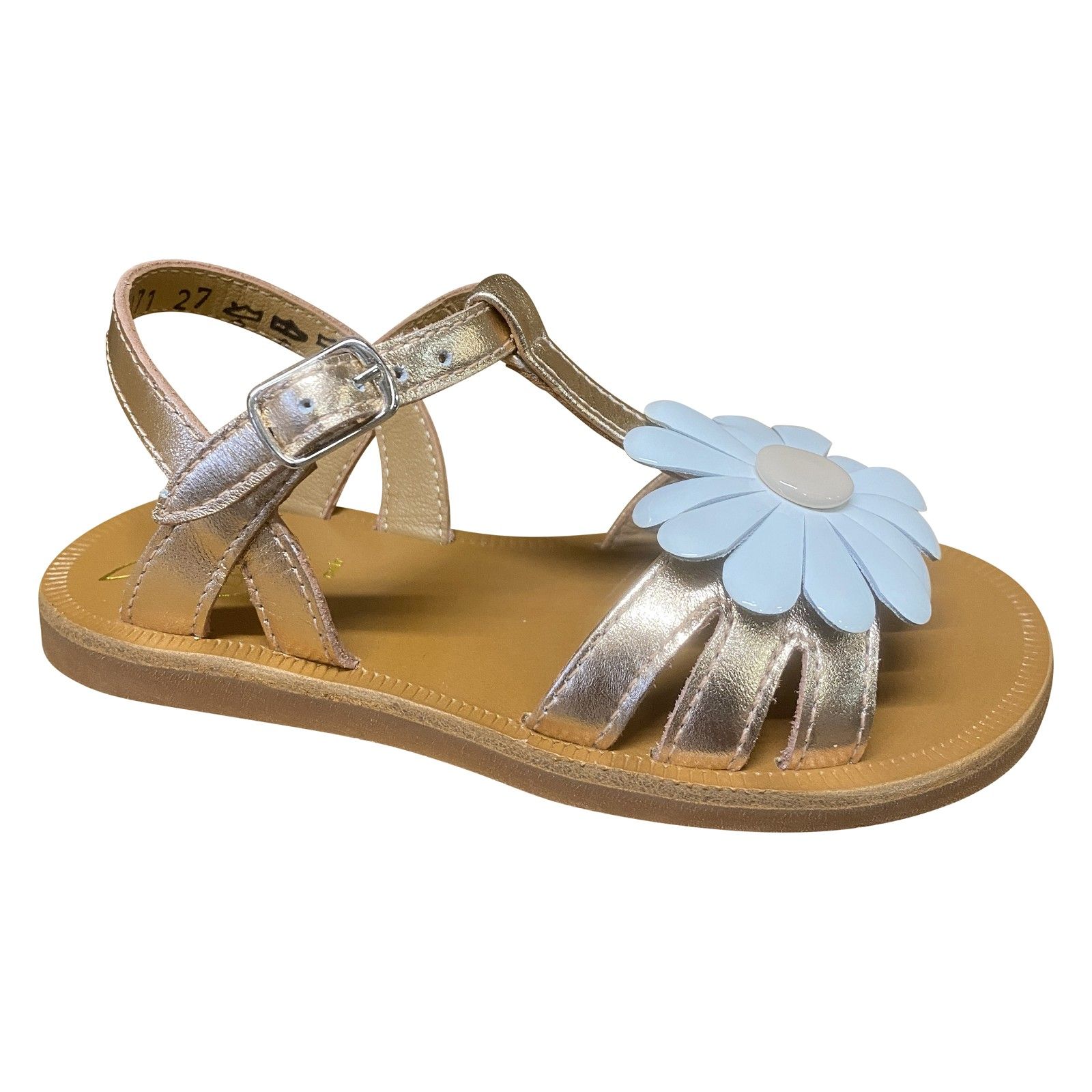 Elegante open meisjessandaal van Pom d’Api met T-band en gespsluiting.