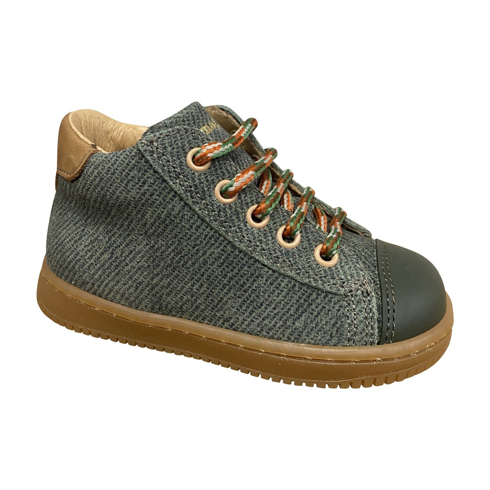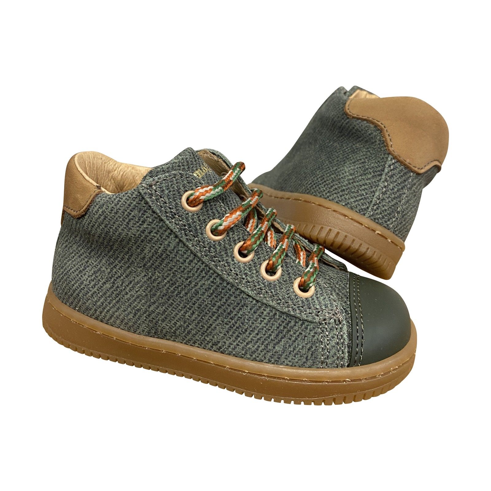 De kaki tinten, cognackleurige accenten en fijne stiksels geven het model een stoere, natuurlijke uitstraling. De lichte, soepele zool met goede grip maakt dit paar perfect voor dagelijkse avonturen en de eerste stappen buiten.
