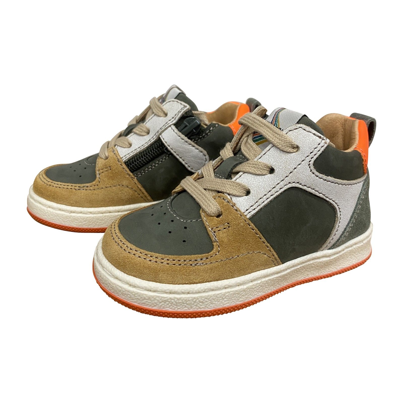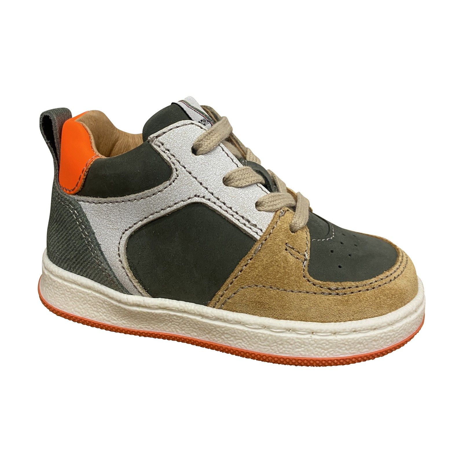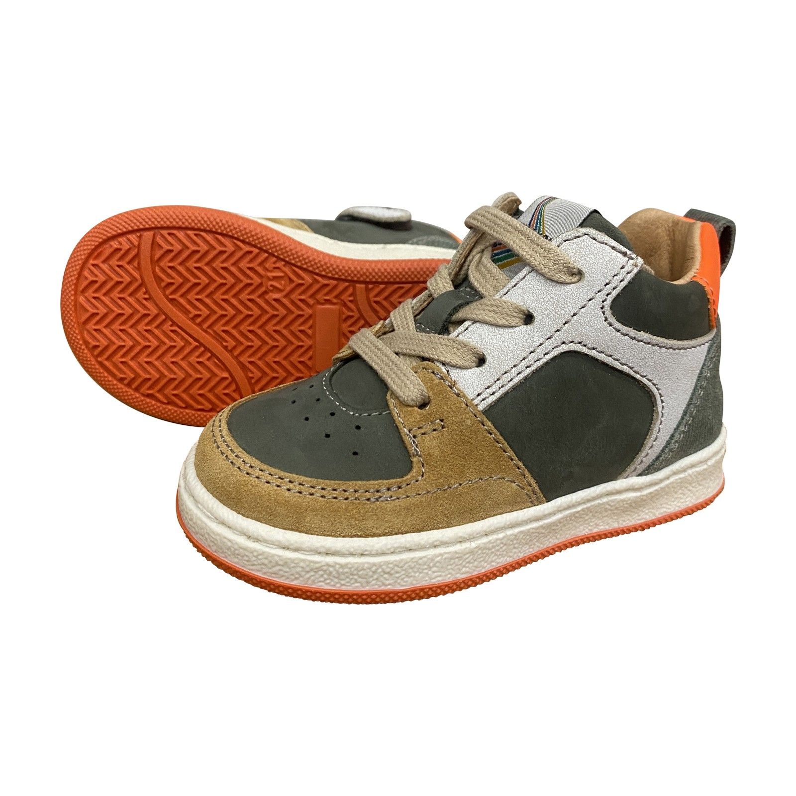 De mix van groen, cognac, grijs en een frisse oranje toets geeft het model een stoere, sportieve uitstraling. Een duurzaam en flexibel paar dat moeiteloos meegroeit met alle avonturen van actieve jongens.