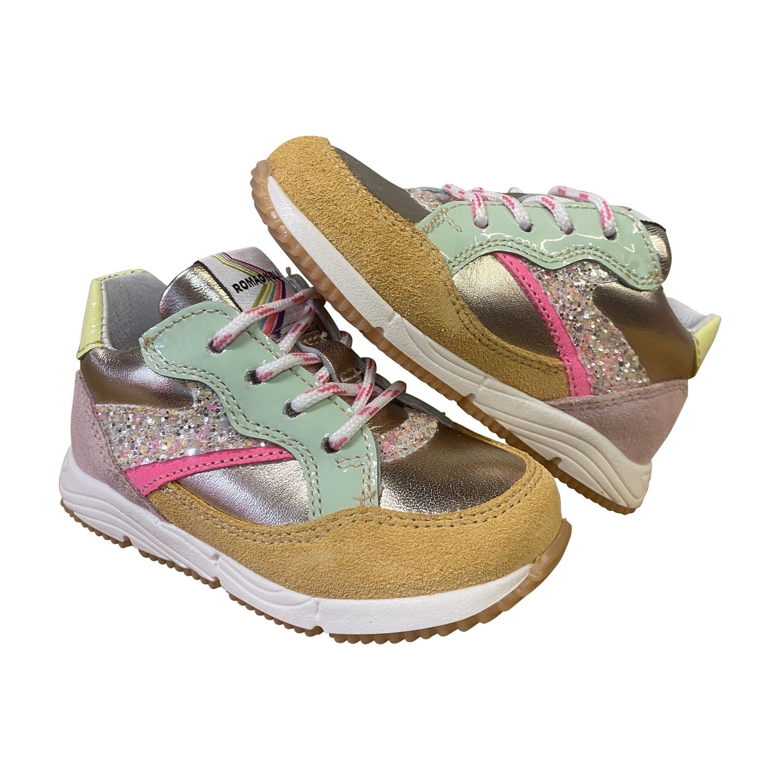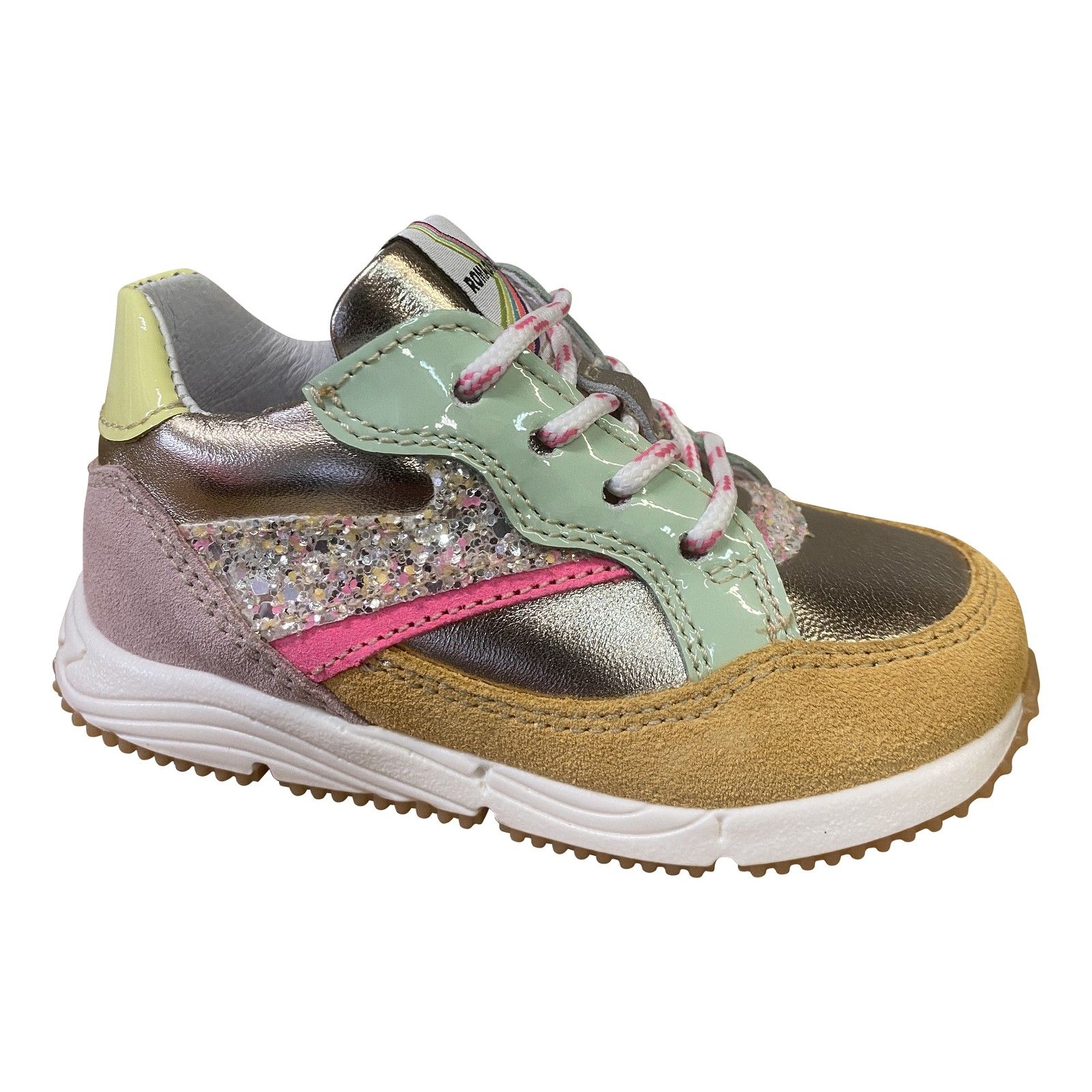 Deze Romagnoli sneaker combineert zacht leder en suède met speelse glitter- en pastelaccenten. De lichte, flexibele zool ondersteunt een natuurlijke afrol en zorgt voor comfortabel stappen de hele dag door. Dankzij de goede pasvorm en stevige hiel is dit een ideale sneaker voor actieve meisjes.