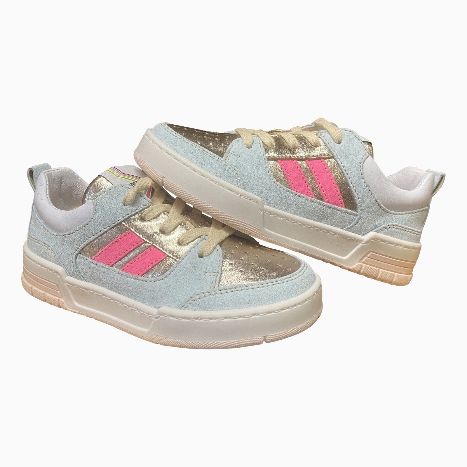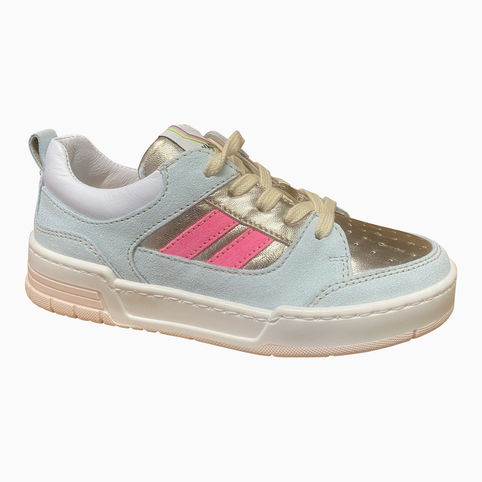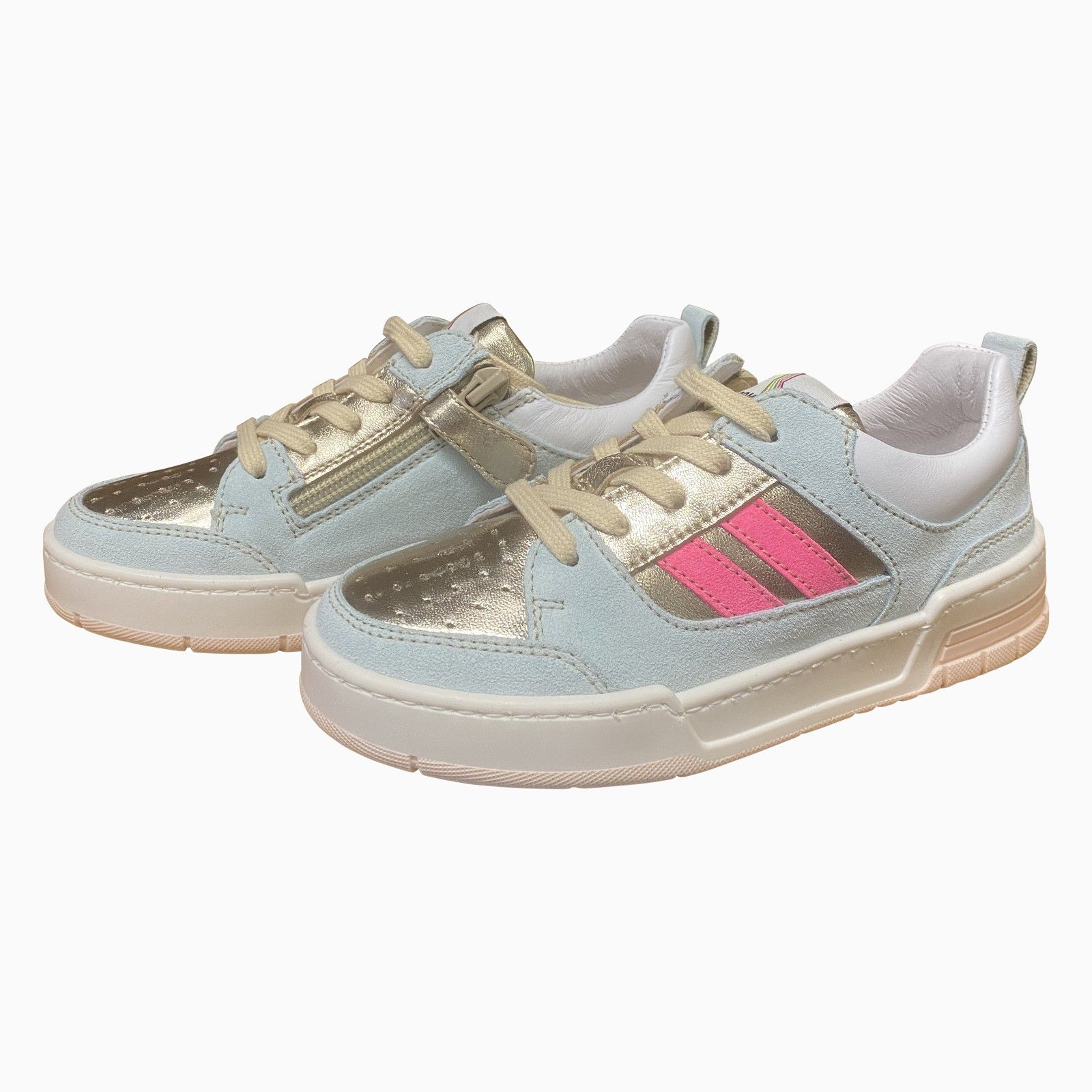Sportieve meisjes sneaker met veters en een praktische ritssluiting. Gemaakt van leer en suède met metallic accenten en roze details voor een speelse uitstraling. De stevige zool biedt goede ondersteuning en grip, terwijl de zachte voering zorgt voor extra comfort bij dagelijks gebruik.