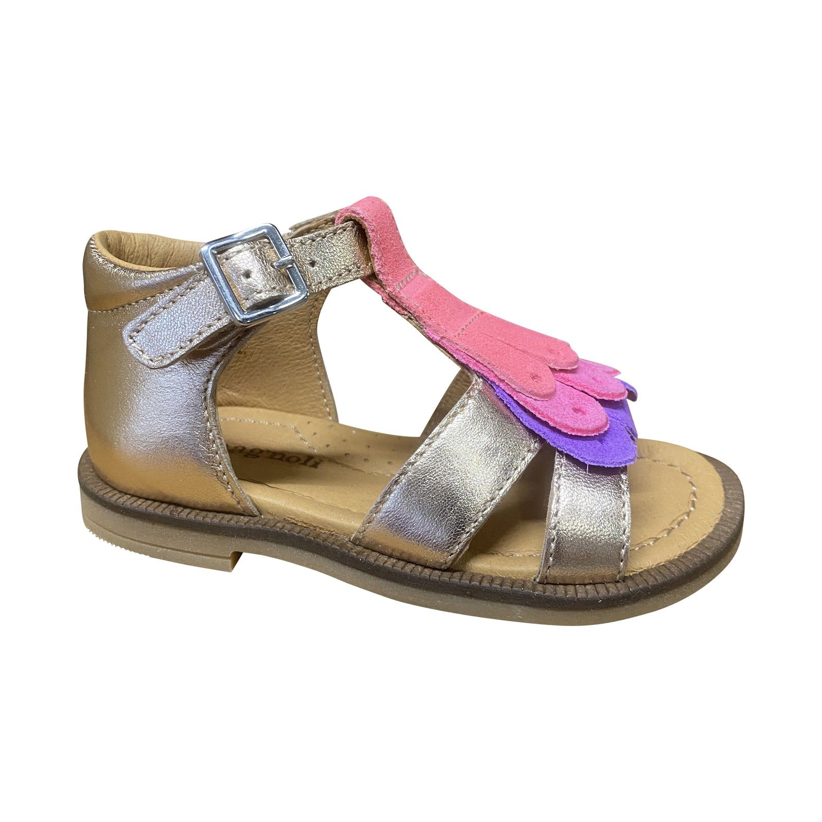 Speelse meisjes sandaal met gespsluiting en een gesloten hiel voor extra steun. Gemaakt van leer met kleurrijke suède details op de voorband voor een vrolijke uitstraling. De zachte voering en het comfortabele voetbed zorgen voor prettig draagcomfort. De stevige zool biedt stabiliteit en is ideaal voor zomerse dagen.