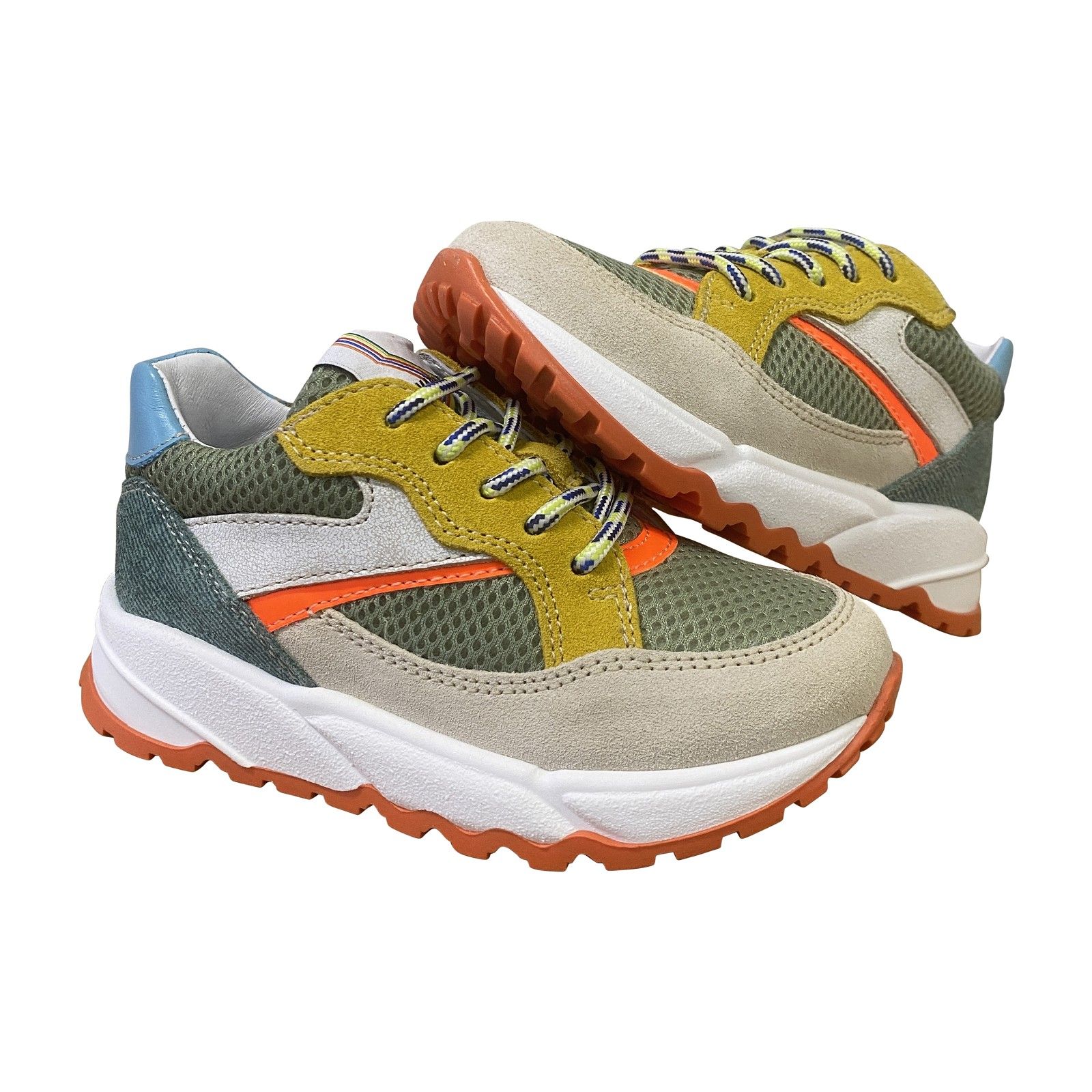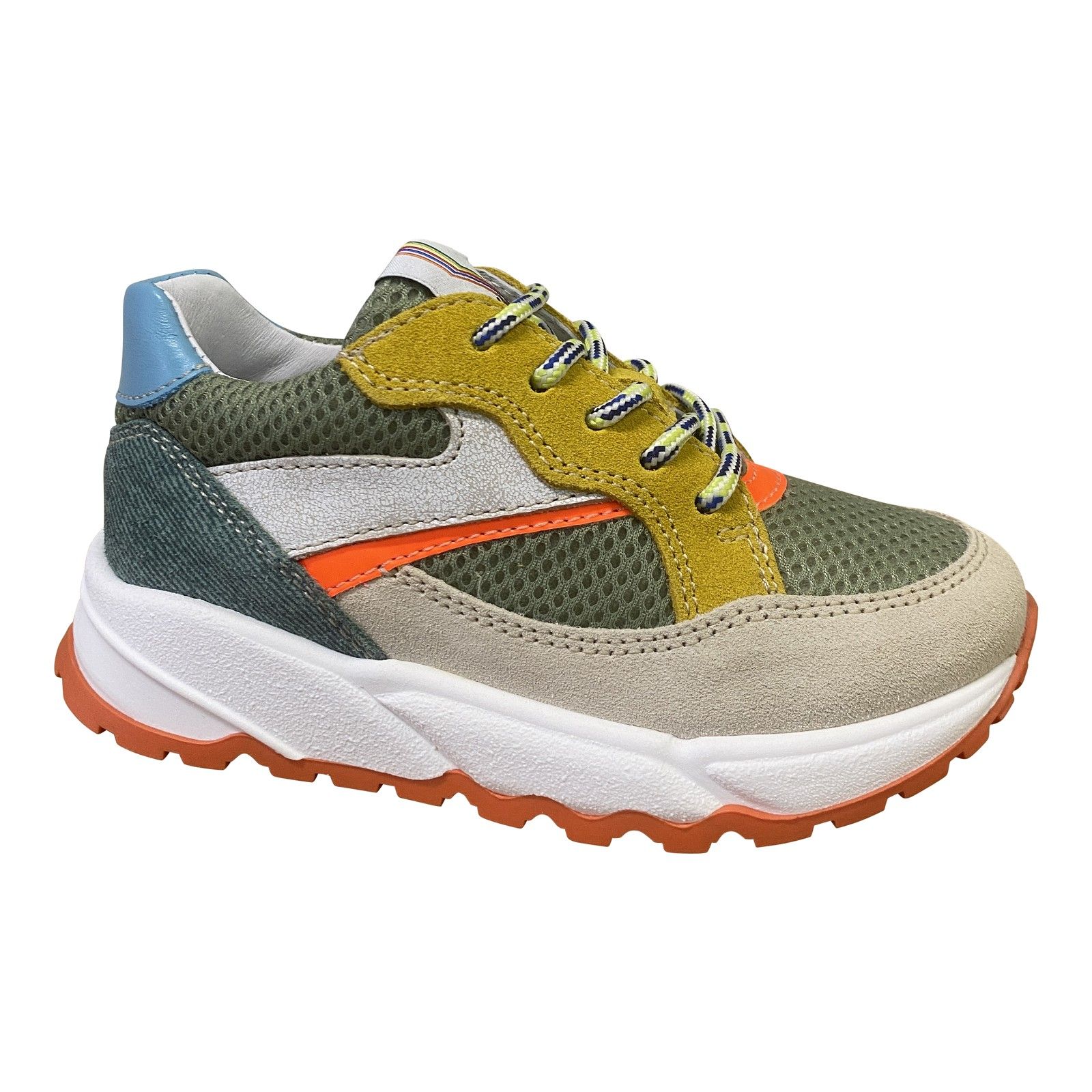 Deze stoere Romagnoli jongenssneaker met veters en rits is perfect voor actieve jongens. De combinatie van groen mesh, beige suède, okergele details en een oranje accent geeft de schoen een sportieve en frisse uitstraling. De ritssluiting zorgt voor makkelijk aan- en uittrekken, terwijl de veters een goede pasvorm garanderen. Stevig, comfortabel en ideaal voor dagelijks gebruik.