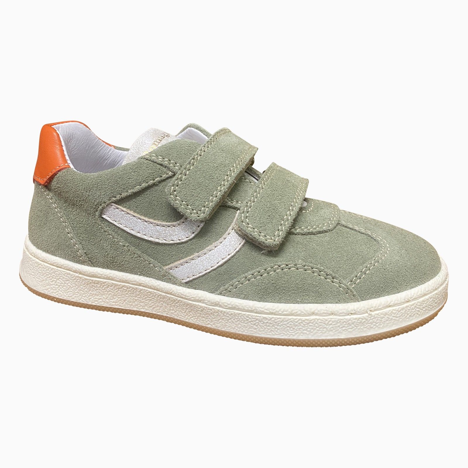 Sportieve jongens sneaker met dubbele klittenbandsluiting (velcro). Gemaakt van leer, suède en ademend mesh voor een comfortabele en stevige pasvorm. De kaki kleur met blauw hielaccent en twee witte strepen zorgt voor een sportieve uitstraling. De flexibele rubberen zool biedt goede grip en ondersteuning bij dagelijks gebruik.