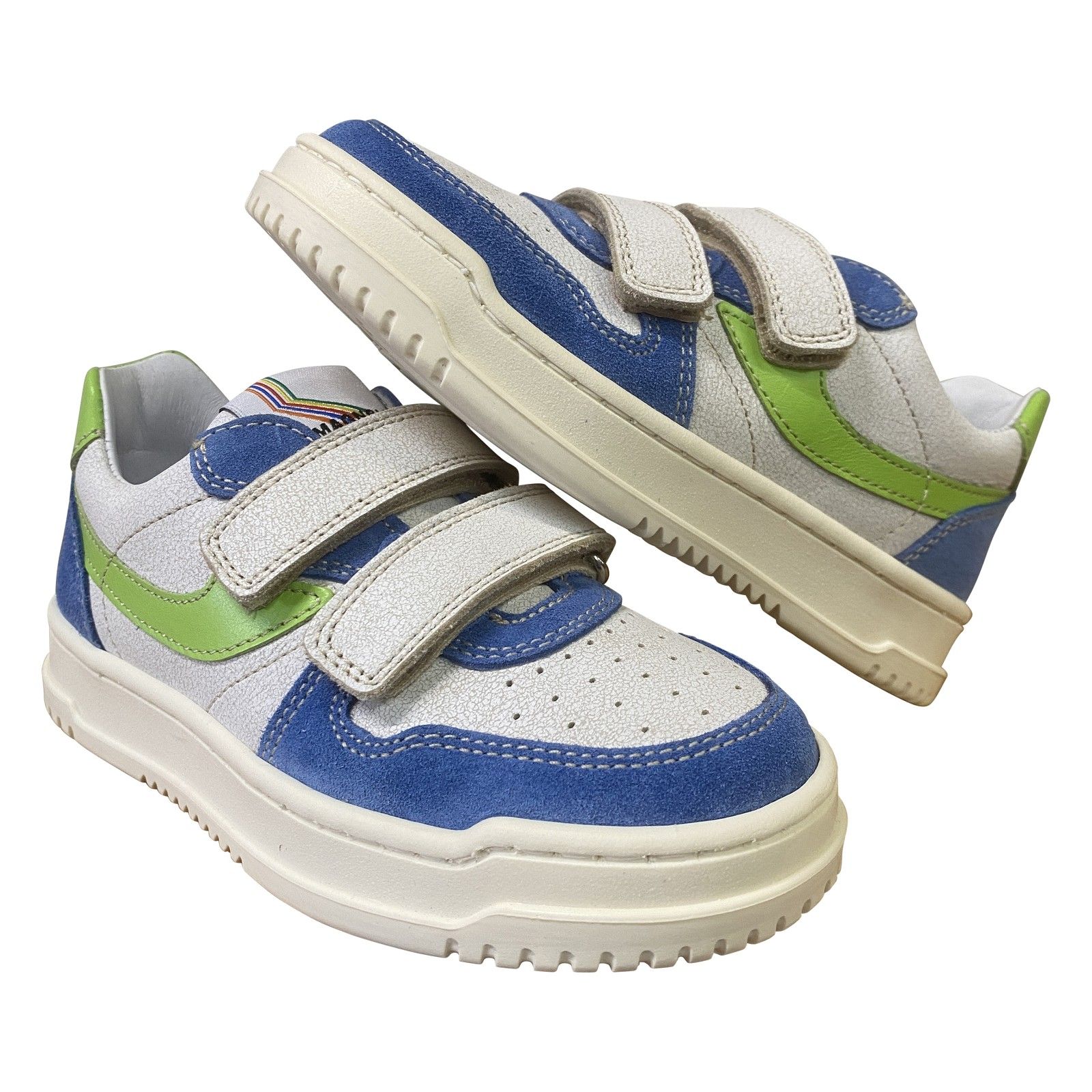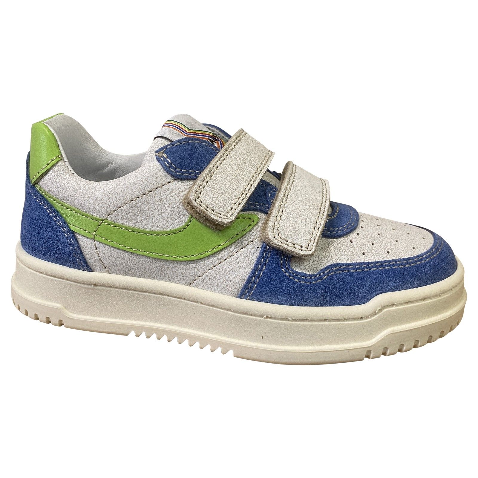 Deze Romagnoli jongensschoen met velcro is ideaal voor actieve kinderen. Dankzij de twee klittenbandsluitingen gaat de schoen makkelijk aan en uit en zit hij stevig rond de voet. Het soepele leder, de comfortabele binnenvoering en de flexibele zool zorgen voor aangenaam draagcomfort tijdens spelen, stappen en ravotten. De sportieve kleurcombinatie geeft deze schoen een stoere look.