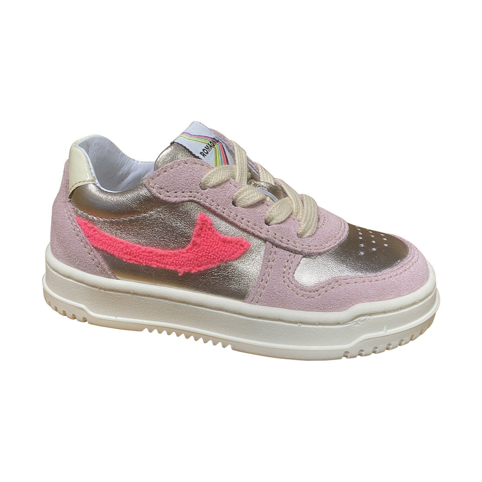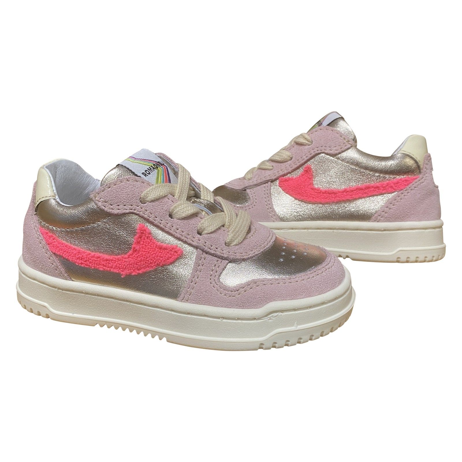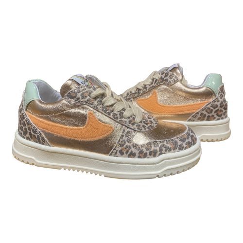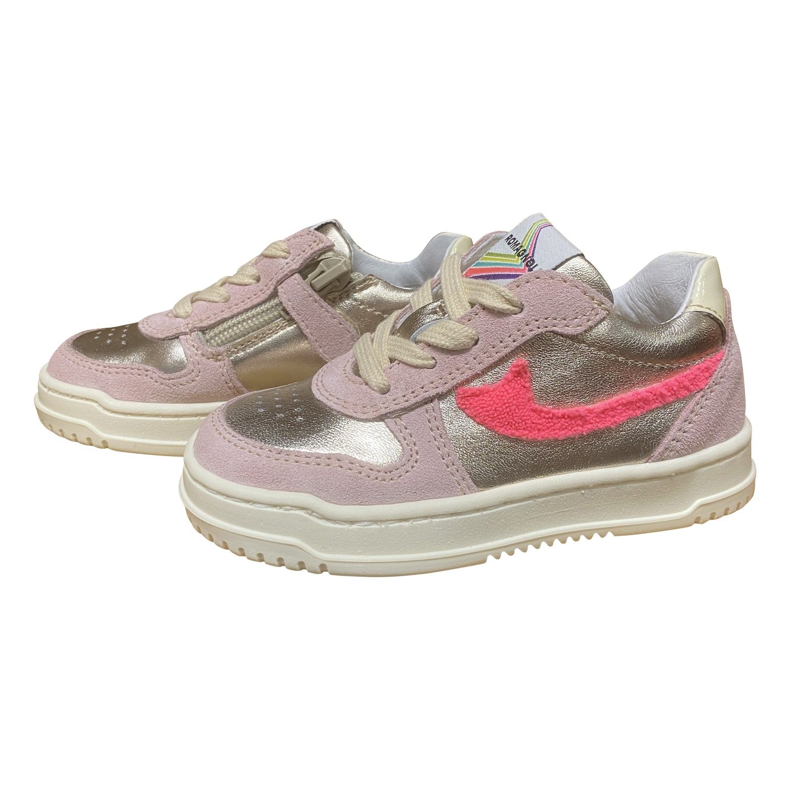 Trendy meisjes sneaker met veters en een praktische ritssluiting. Uitgevoerd in een combinatie van leer, suède en metallic accenten voor een speelse en moderne uitstraling. De zachte voering en stevige pasvorm zorgen voor comfort, terwijl de flexibele rubberen zool goede grip biedt bij dagelijks gebruik.