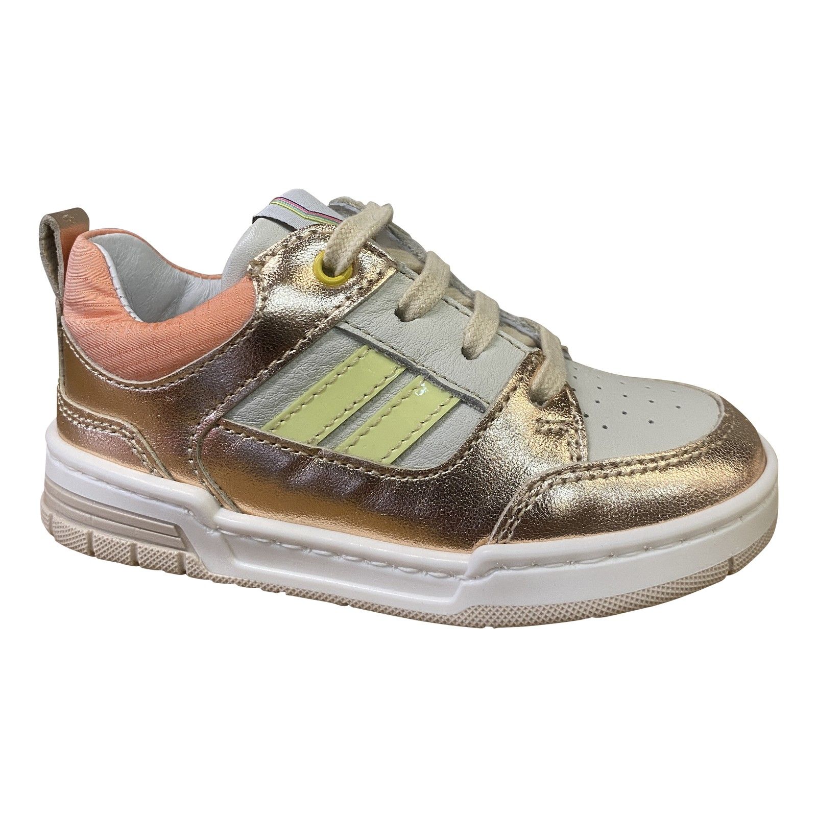Deze Romagnoli sneaker is perfect voor het kleine stoere meisje. Het bovenwerk in zacht leder met metallic accenten geeft een speelse look, terwijl de veter- en ritssluiting zorgen voor een makkelijke instap en een stevige pasvorm. De flexibele zool ondersteunt elke stap, ideaal voor actieve voetjes.