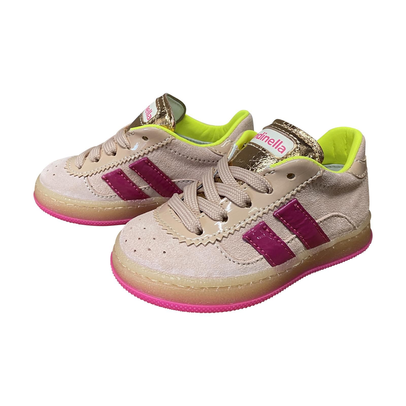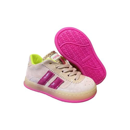 Lieve eerste-stappers sneaker van Rondinella in nude met fuchsia accenten en goud detail. Gemaakt uit zacht leder met soepele loopzool voor fijne ondersteuning. Ideaal voor meisjes die hun eerste stapjes zetten.