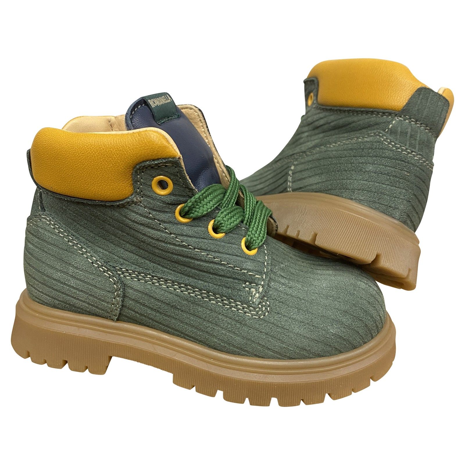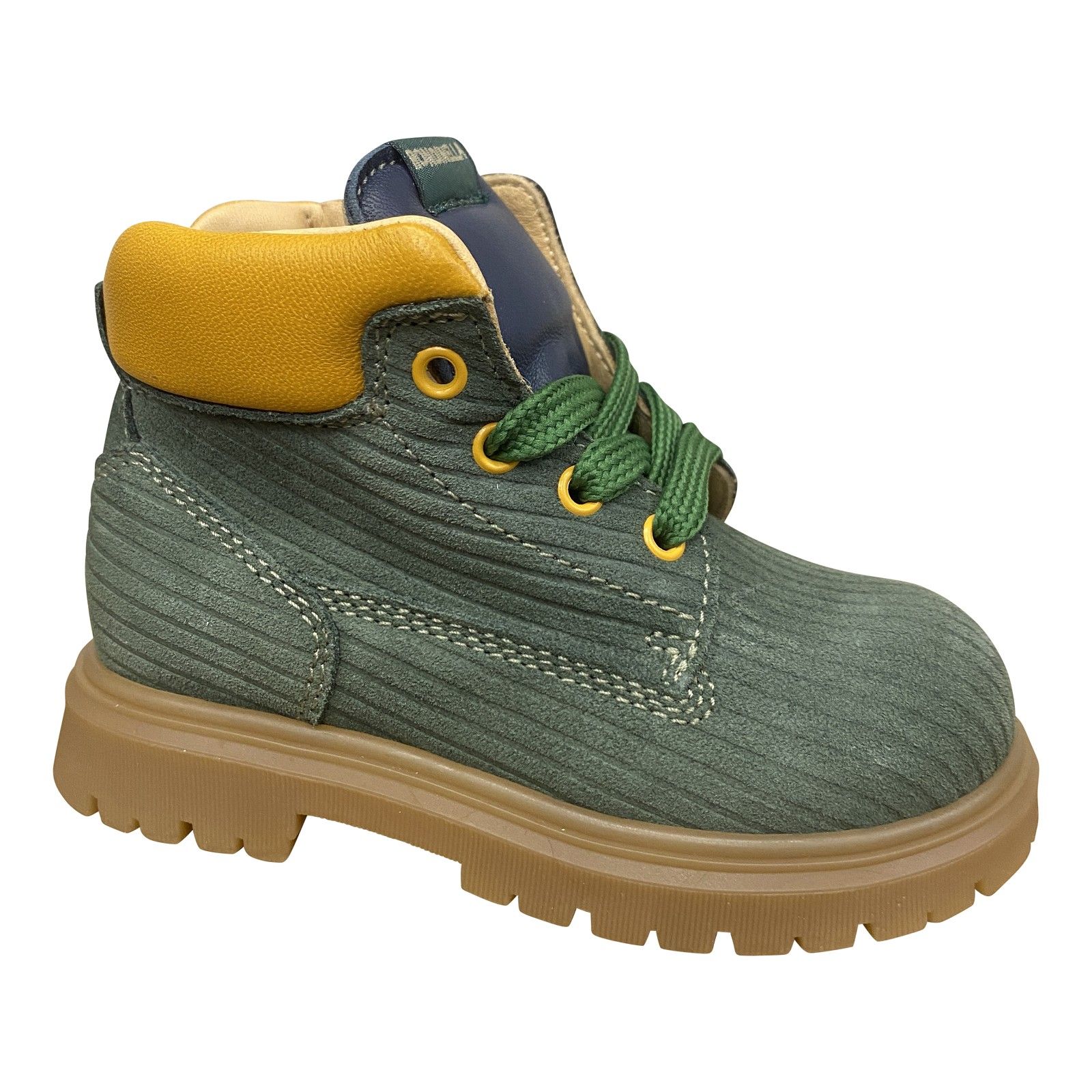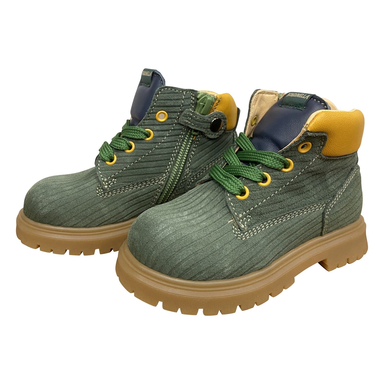 Deze stoere Rondinella bottine in kaki nubuck valt op door zijn mosterdgele kraag, groene veters en stevige profielzool. Het zachte nubuck en de veter-rits sluiting zorgen voor een vlotte instap en een fijne, stabiele pasvorm. Een duurzaam, speels en unisex model dat zowel jongens als meisjes graag dragen — ideaal voor school, buiten spelen en dagelijks avontuur.