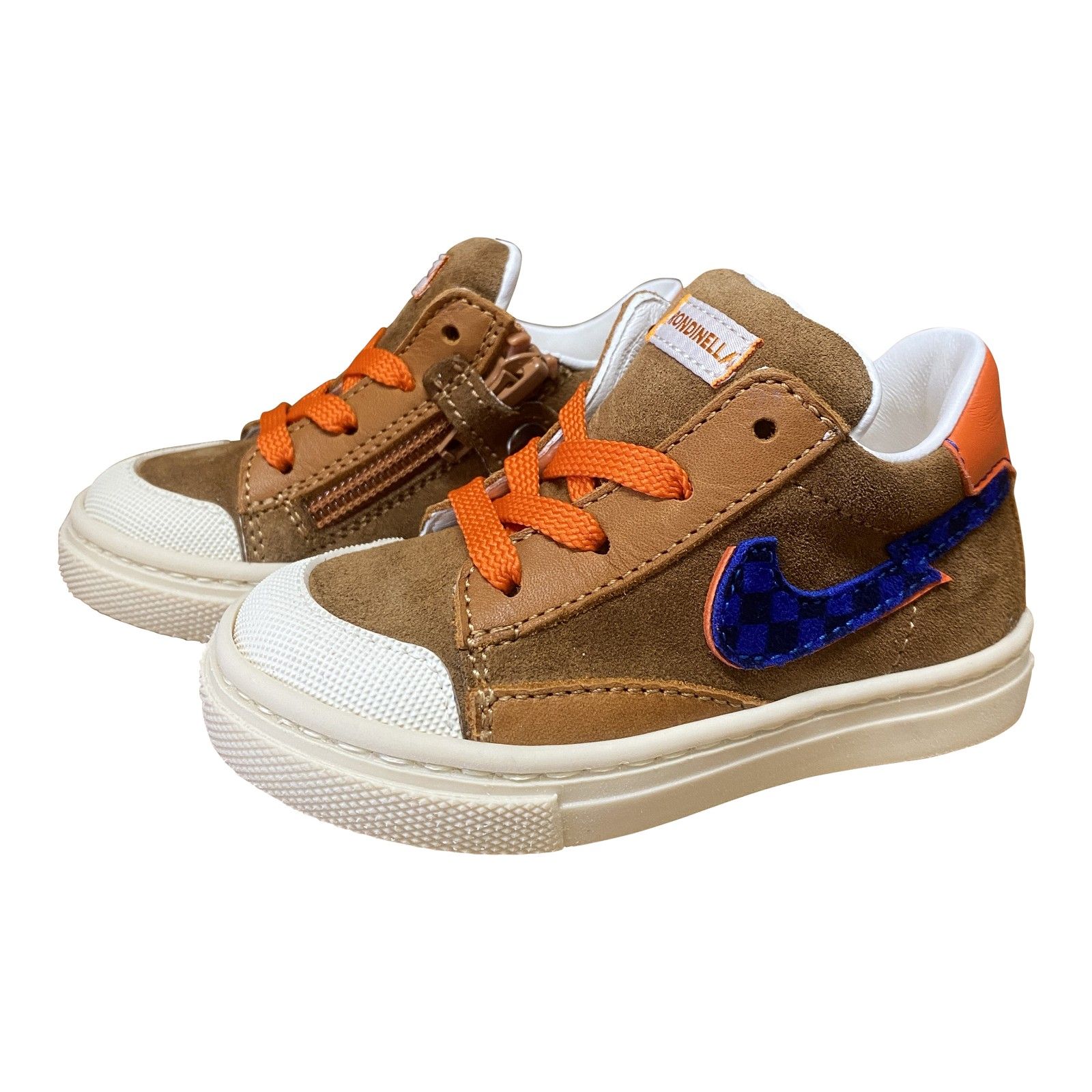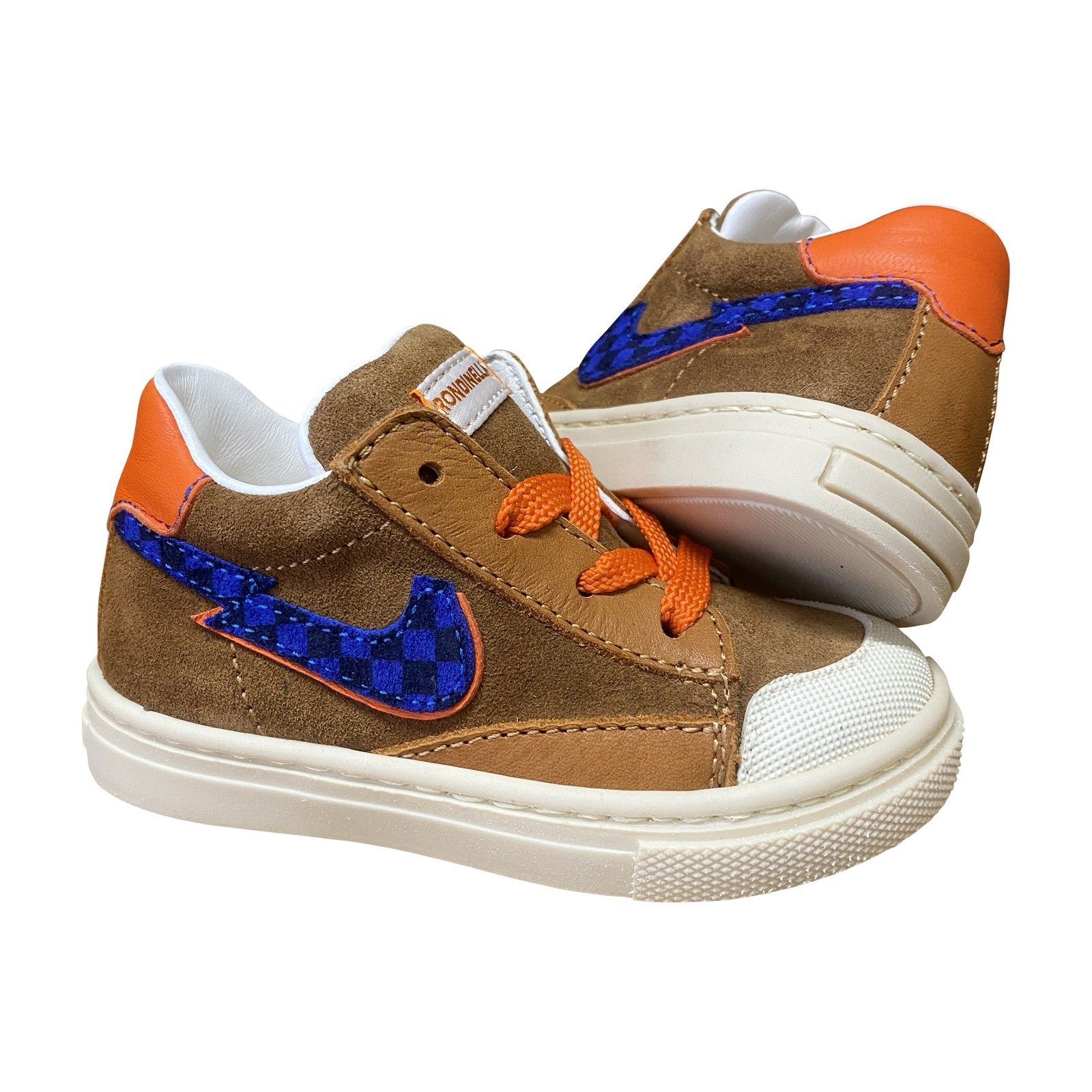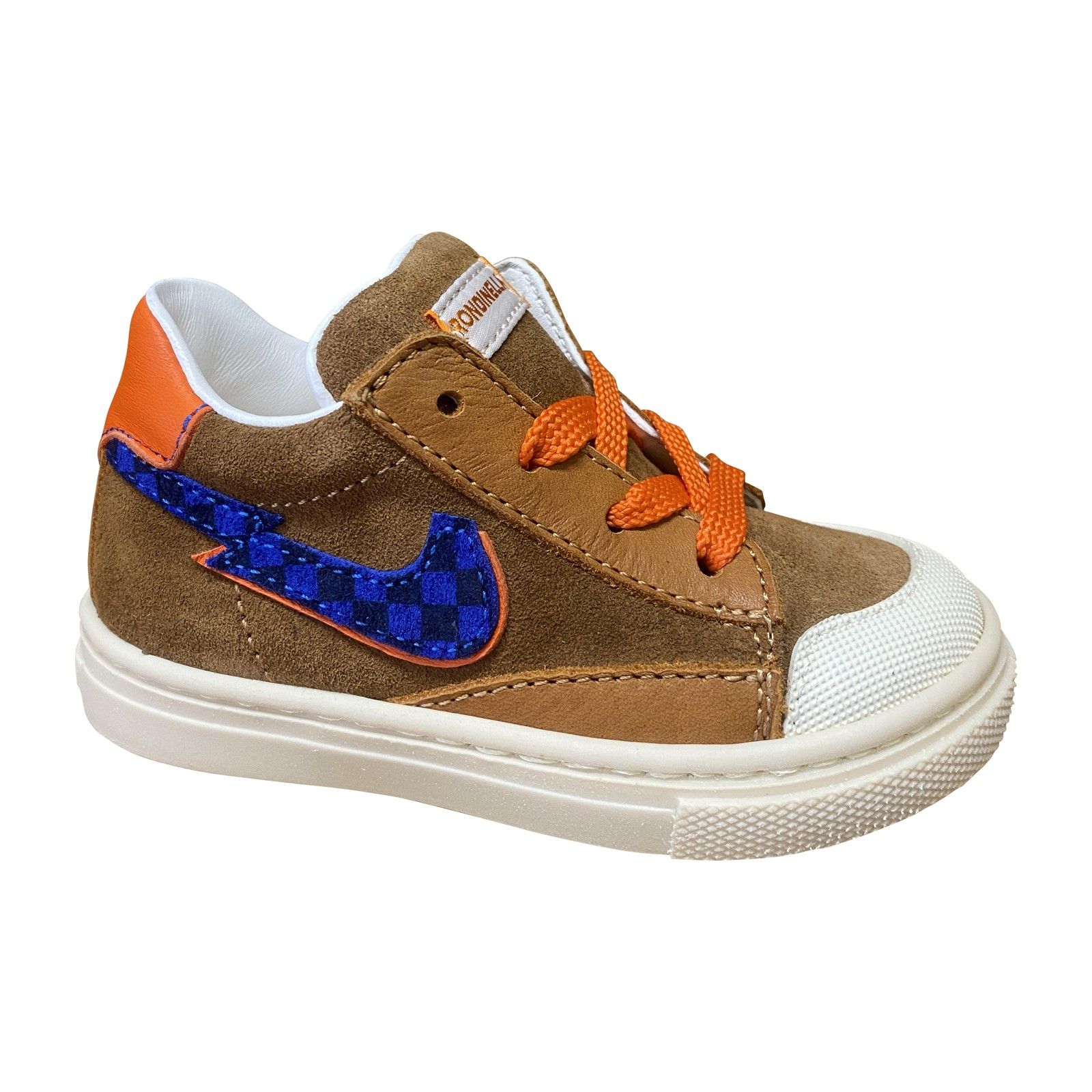 Deze stoere jongenssneaker van Rondinella combineert warme roest- en cognactinten met opvallende blauwe details. Het suède en leder zorgen voor een zachte, stevige afwerking, terwijl de oranje veters extra karakter geven. Dankzij de stevige neusbescherming en de comfortabele pasvorm is dit model ideaal voor actieve jongens — perfect voor school, buiten spelen en dagelijks avontuur.
