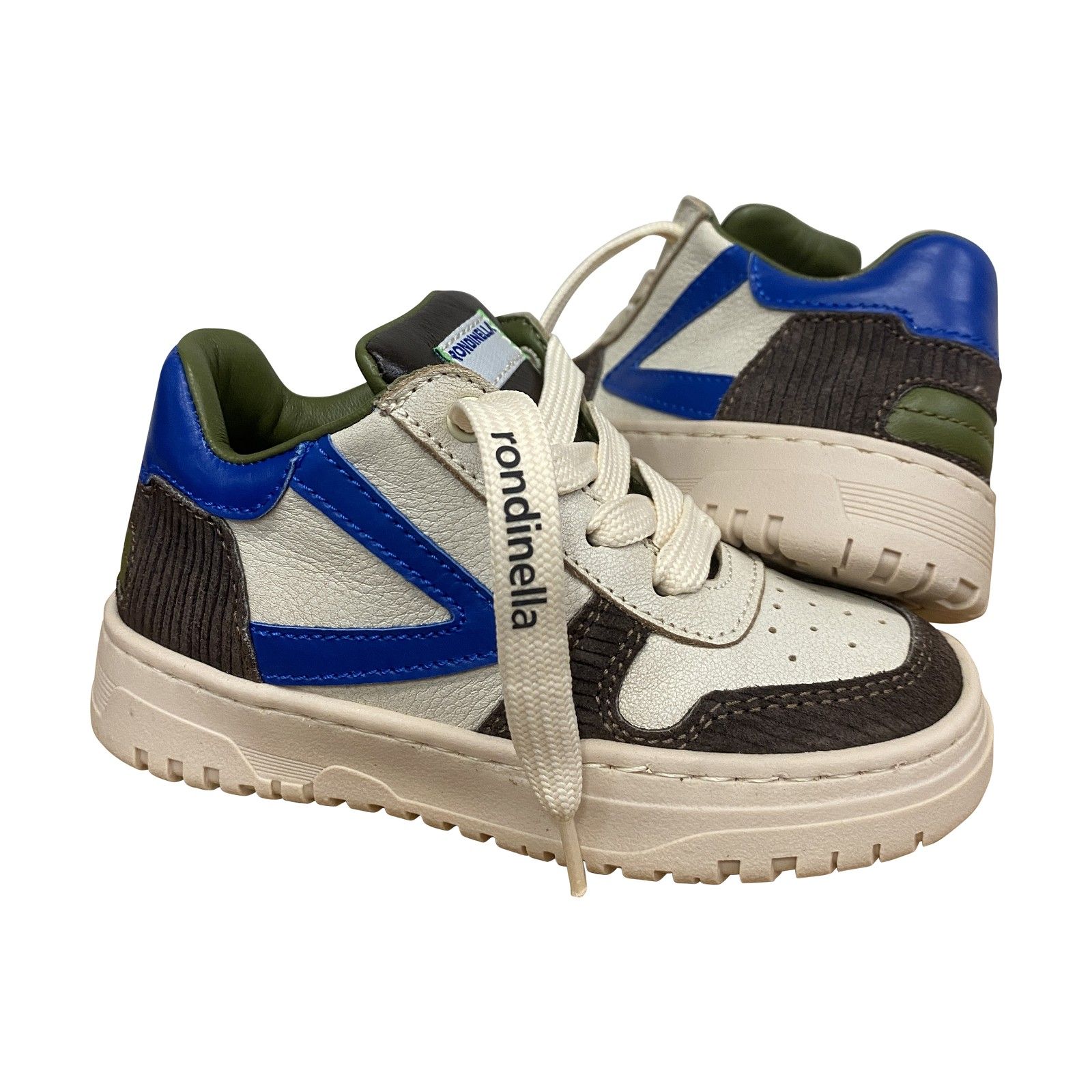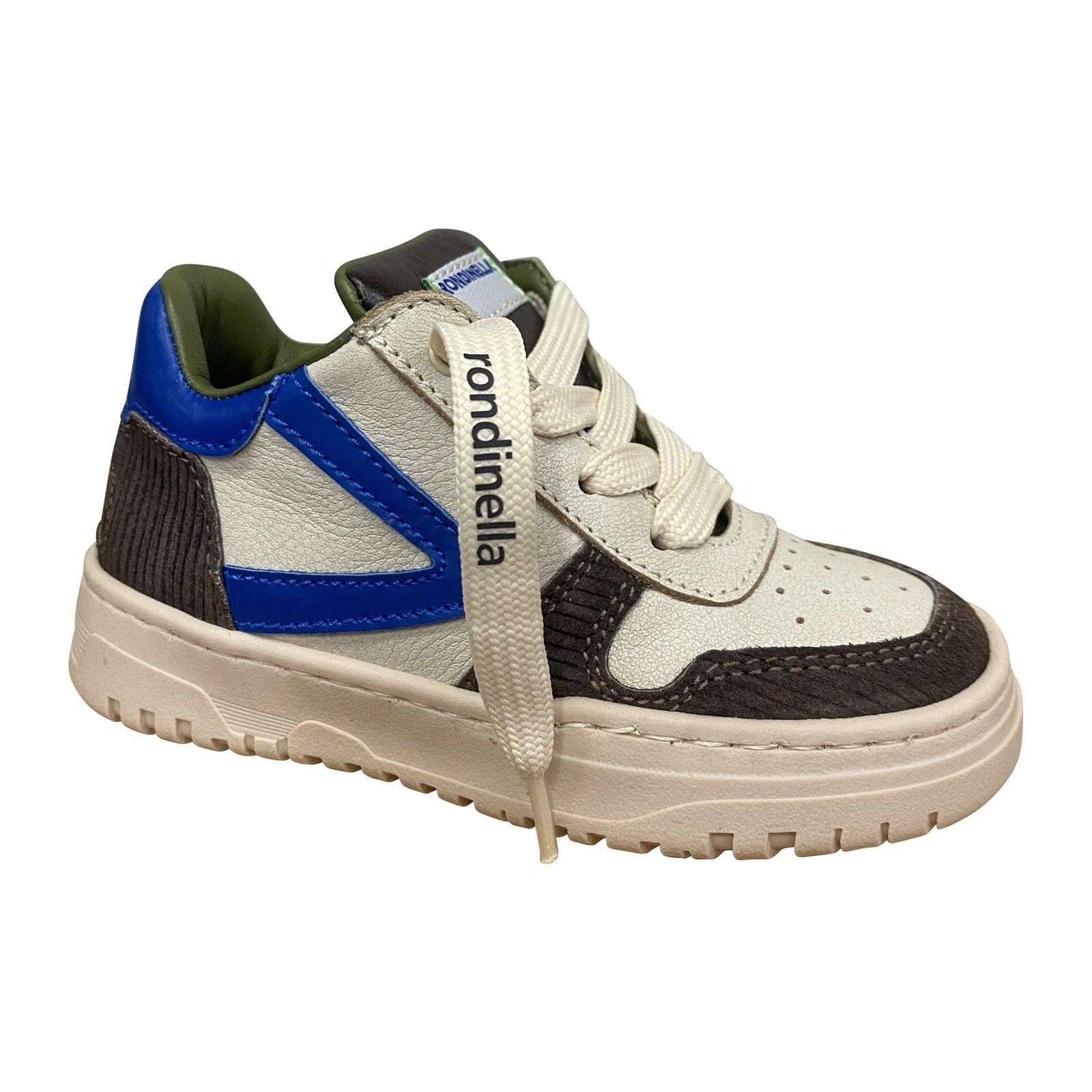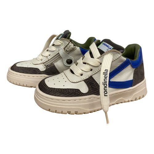 Deze sportieve jongenssneaker van Rondinella combineert witte en donkerbruine lederdelen met frisse blauwe en groene accenten. De stevige zool zorgt voor goede grip, terwijl de zachte binnenkant en veter-rits sluiting zorgen voor comfort en gemak bij het aan- en uittrekken. Een veelzijdig model dat perfect past bij school, vrije tijd en actieve speelmomenten.