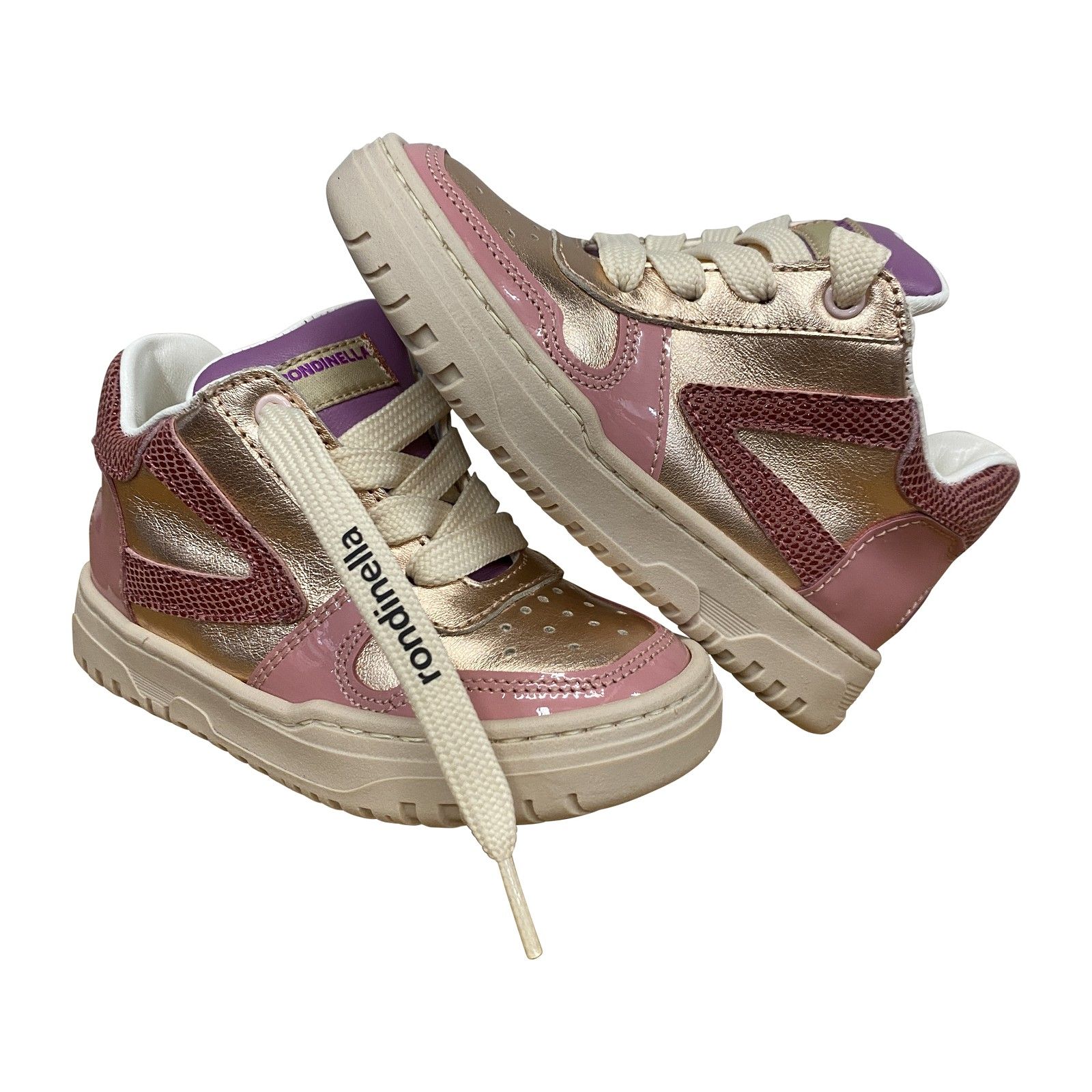 Deze meisjes­sneaker van Rondinella combineert zachte rozetinten met glanzende gouden accenten en een speels lila detail op de tong. De mix van metallic leder, lak en mesh maakt dit model extra opvallend, terwijl de veter-rits sluiting zorgt voor een vlotte instap. De stevige zool en zachte binnenvoering bieden comfort voor elke dag. Een echt girly model dat meteen vrolijkheid toevoegt aan elke outfit.