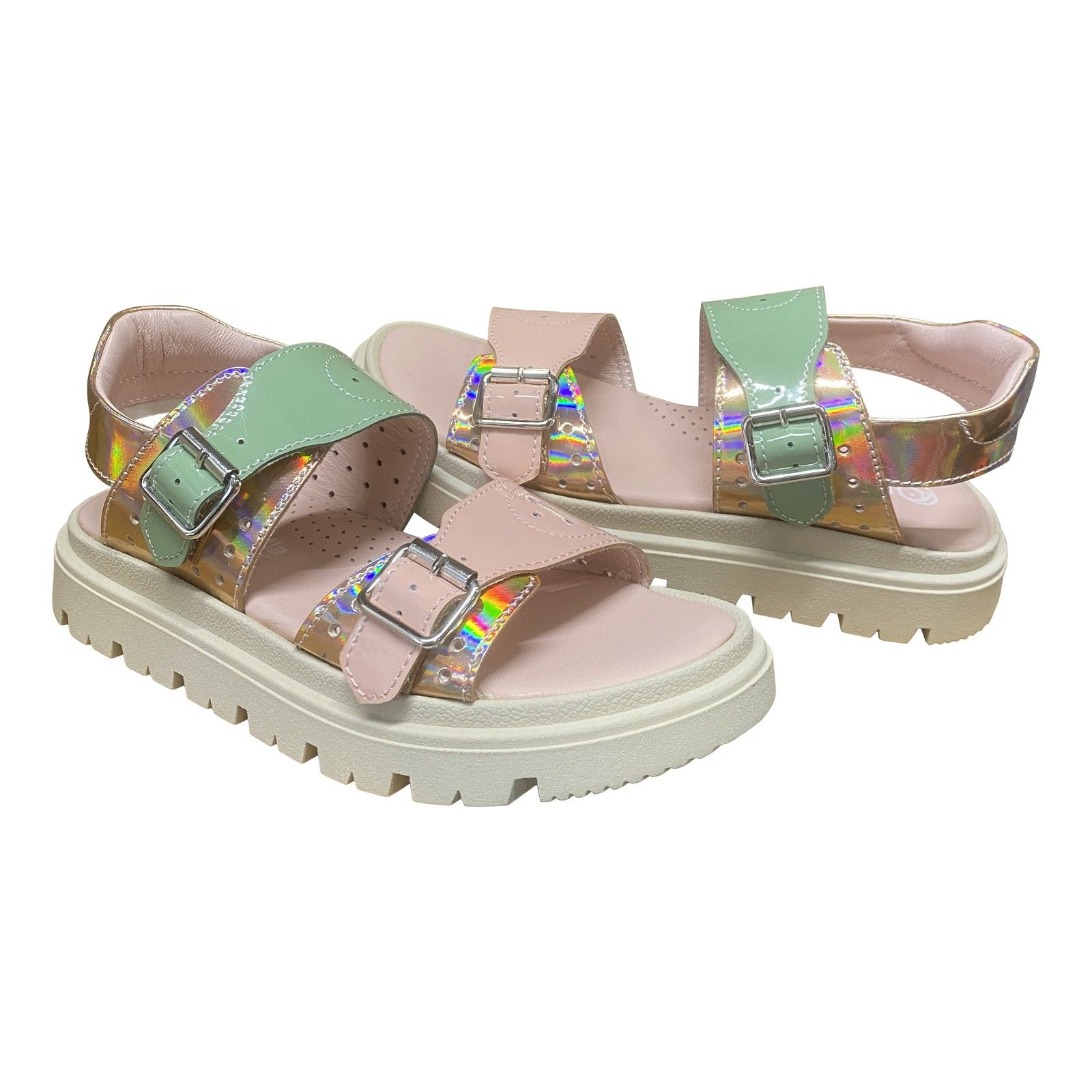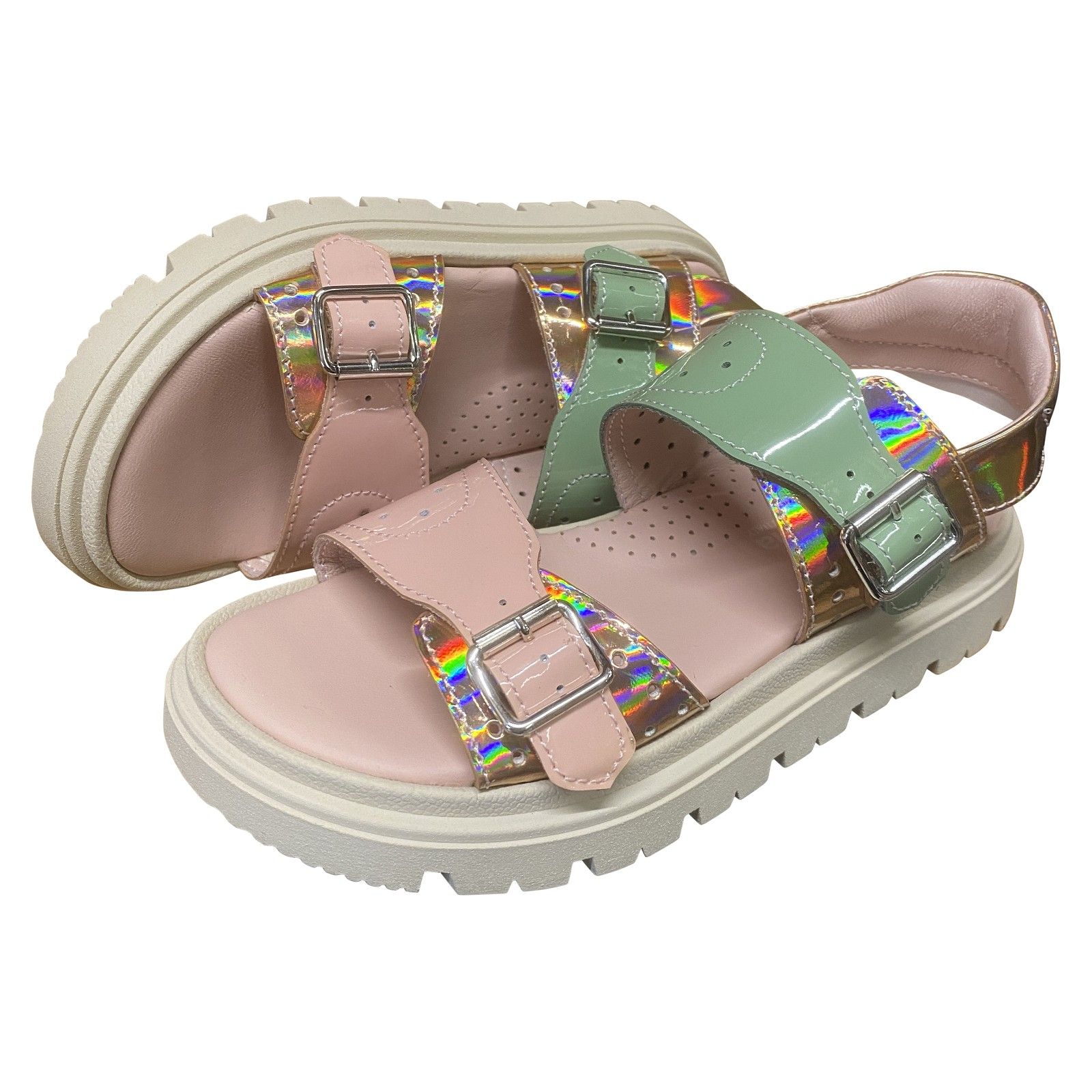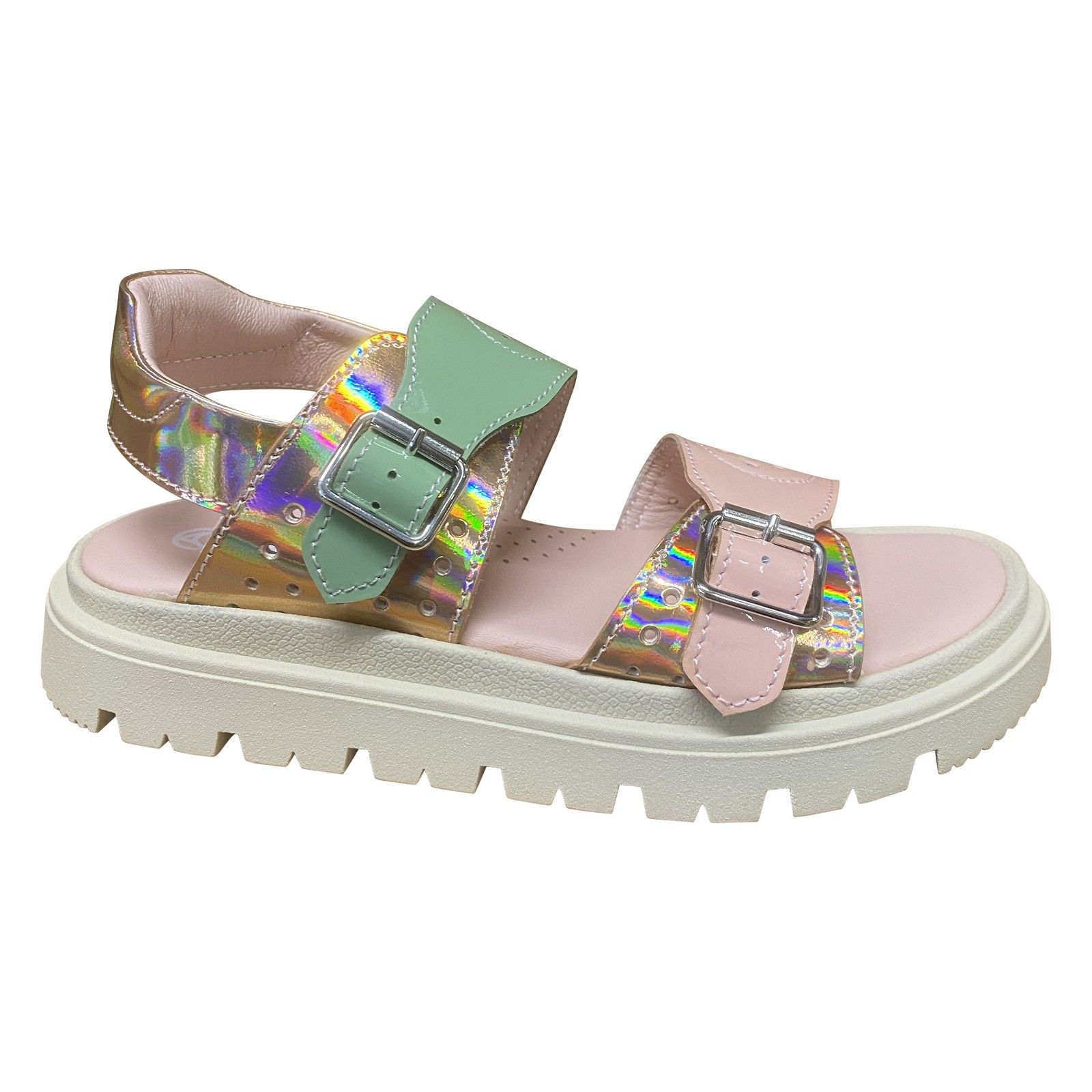 Sportieve open meisjes sandaal met twee verstelbare gespsluitingen. Gemaakt van leer met herstelbaar wrijf-effect en opvallende metallic details voor een speelse uitstraling. Het zachte voetbed en de stevige, lichtgewicht zool zorgen voor comfortabel draagplezier tijdens zomerse dagen.