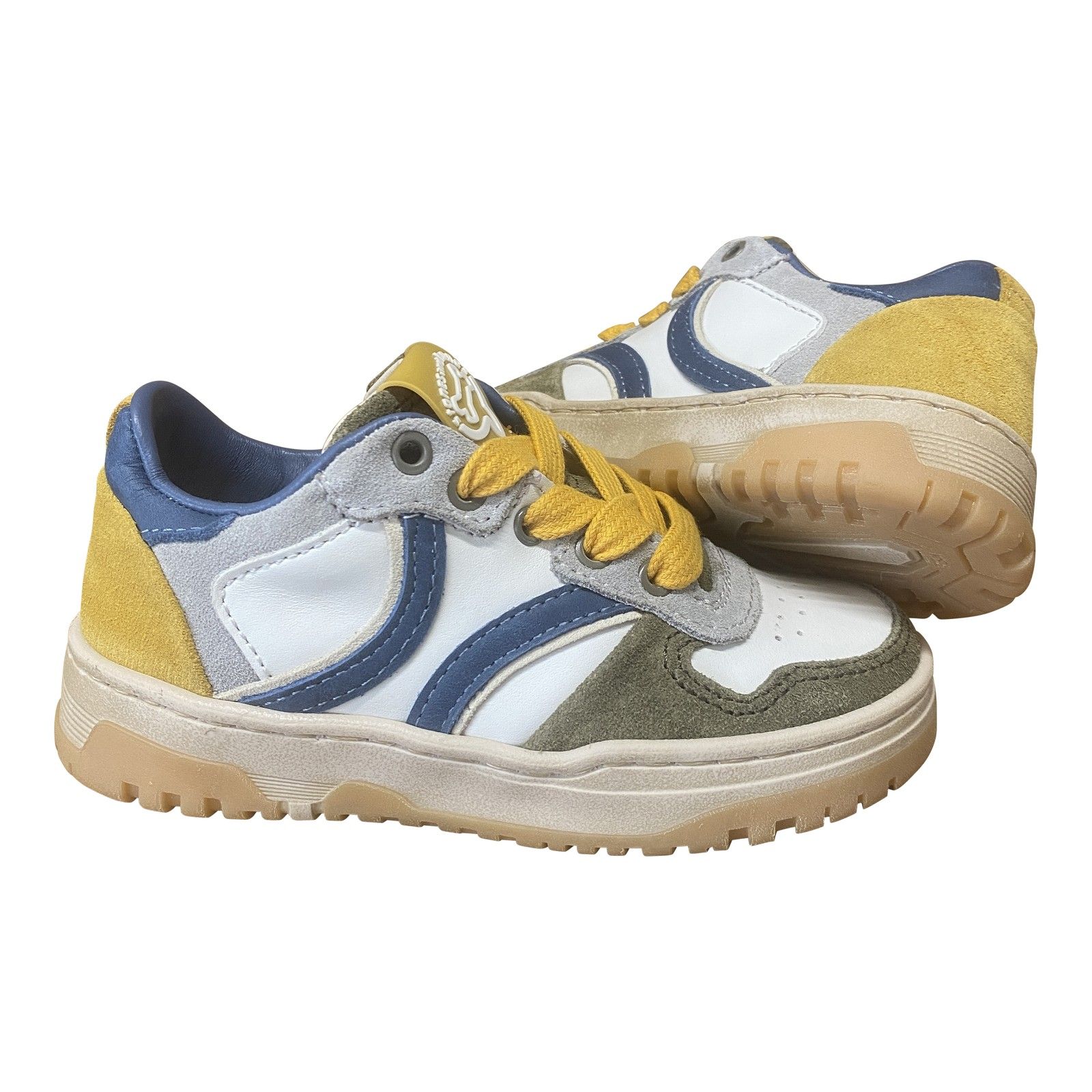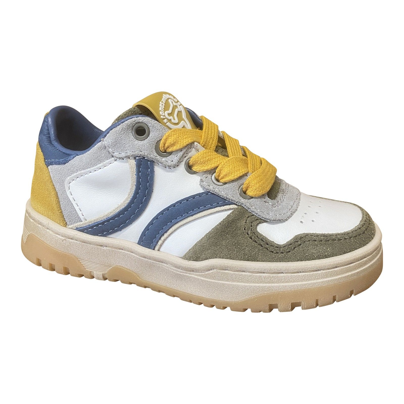 Lage sportieve sneaker van Stones and Bones met veters en ritssluiting voor een vlotte instap en goede ondersteuning. De witte basis wordt speels gecombineerd met okergeel, cobaltblauw en kaki, wat zorgt voor een stoere maar modieuze uitstraling. Afgewerkt met een stevige, modieuze zool, ideaal voor actieve stoere kerels.
