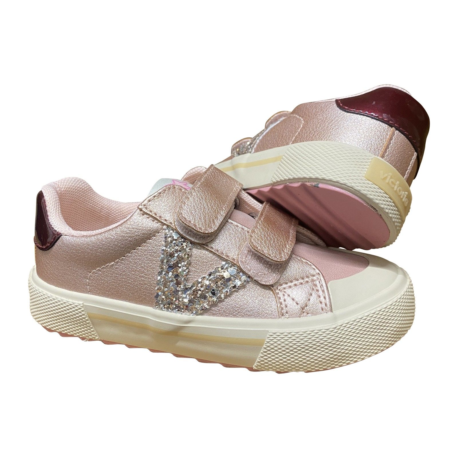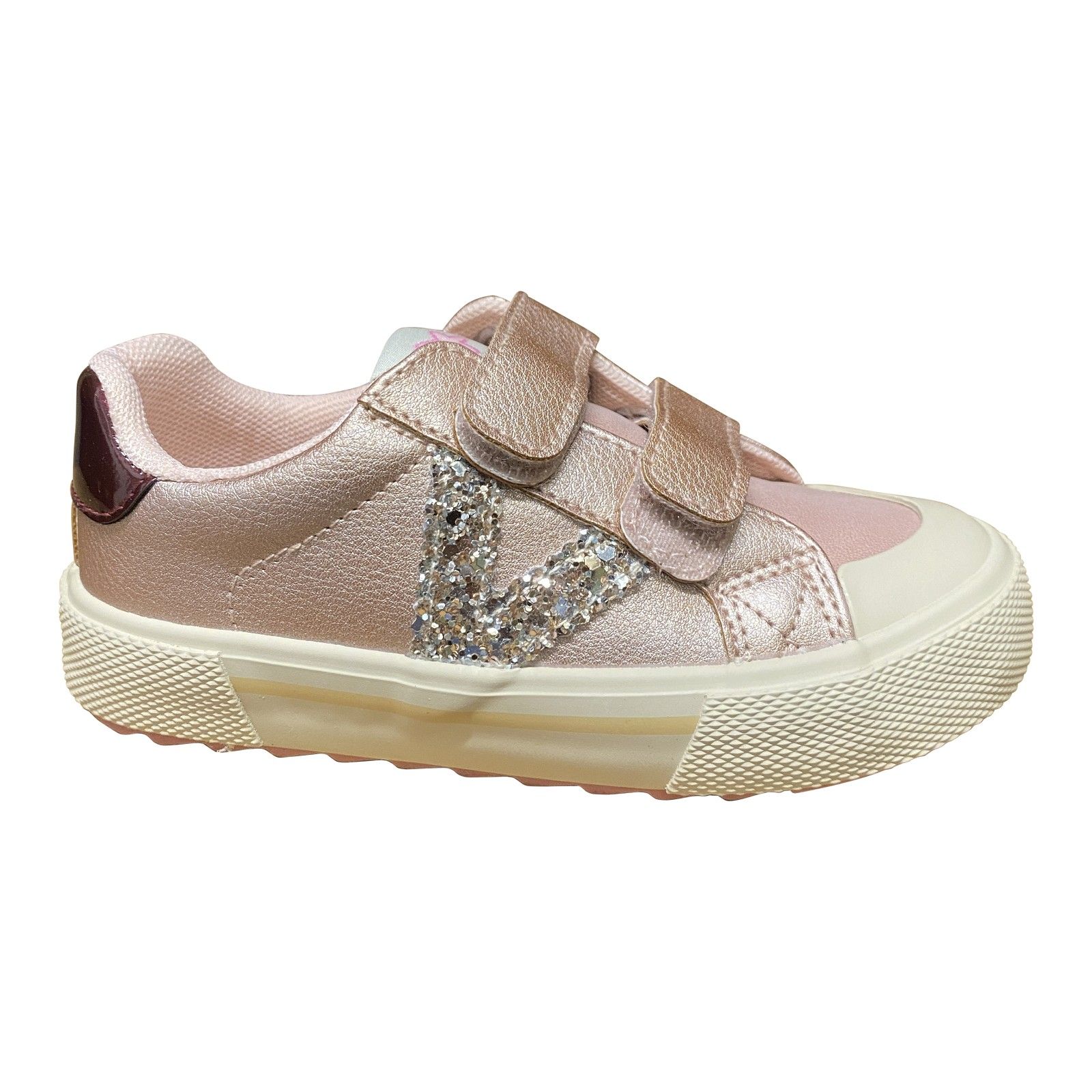 Opvallende rose metallic sneaker met fonkelende glitterlook. Licht van gewicht met dubbele velcro voor extra gemak. Een echte blikvanger voor kleine fashionista’s.